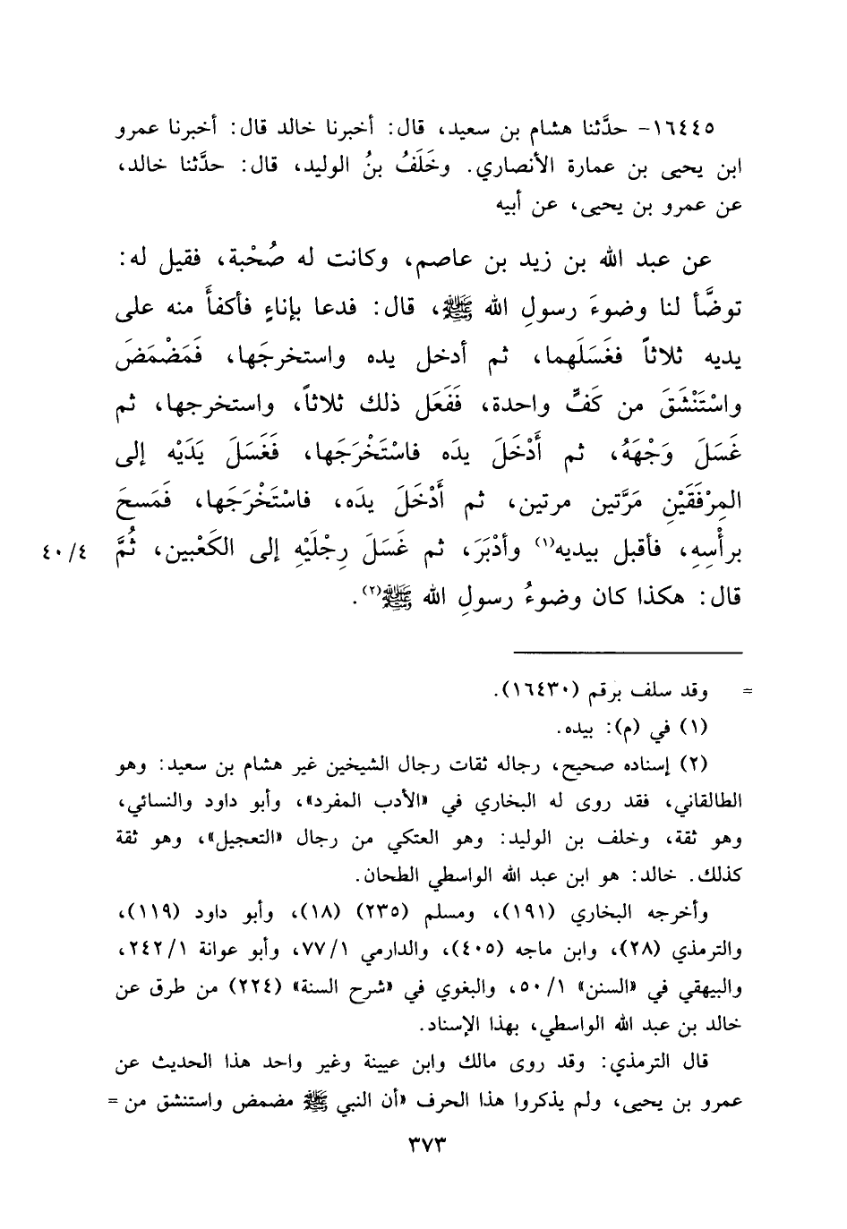 ١٦٤٤٥ - حَدَّثَنَا هِشَامُ بْنُ سَعِيدٍ، قَالَ: أَخْبَرَنَا خَالِدٌ قَالَ: أَخْبَرَنَا عَمْرُو بْنُ يَحْيَى بْنِ عُمَارَةَ الْأَنْصَارِيُّ، وَخَلَفُ بْنُ الْوَلِيدِ قَالَ: حَدَّثَنَا خَالِدٌ، عَنْ عَمْرِو بْنِ يَحْيَى، عَنْ أَبِيهِ، عَنْ عَبْدِ اللهِ بْنِ زَيْدِ بْنِ عَاصِمٍ، وَكَانَتْ لَهُ صُحْبَةٌ، فَقِيلَ لَهُ: تَوَضَّأْ لَنَا وُضُوءَ رَسُولِ اللهِ صَلَّى اللهُ عَلَيْهِ وَسَلَّمَ، قَالَ: " فَدَعَا بِإِنَاءٍ فَأَكْفَأَ مِنْهُ عَلَى يَدَيْهِ ثَلَاثًا فَغَسَلَهُمَا، ثُمَّ أَدْخَلَ يَدَهُ وَاسْتَخْرَجَهَا، فَمَضْمَضَ وَاسْتَنْشَقَ مِنْ كَفٍّ وَاحِدَةٍ، فَفَعَلَ ذَلِكَ ثَلَاثًا، وَاسْتَخْرَجَهَا ثُمَّ غَسَلَ وَجْهَهُ، ثُمَّ أَدْخَلَ يَدَهُ فَاسْتَخْرَجَهَا فَغَسَلَ يَدَيْهِ إِلَى الْمِرْفَقَيْنِ مَرَّتَيْنِ مَرَّتَيْنِ، ثُمَّ أَدْخَلَ يَدَهُ فَاسْتَخْرَجَهَا فَمَسَحَ بِرَأْسِهِ فَأَقْبَلَ بِيَدَيْهِ (١) وَأَدْبَرَ، ثُمَّ غَسَلَ رِجْلَيْهِ إِلَى الْكَعْبَيْنِ "، ثُمَّ قَالَ: هَكَذَا كَانَ وُضُوءُ رَسُولِ اللهِ صَلَّى اللهُ عَلَيْهِ وَسَلَّمَ (٢)
