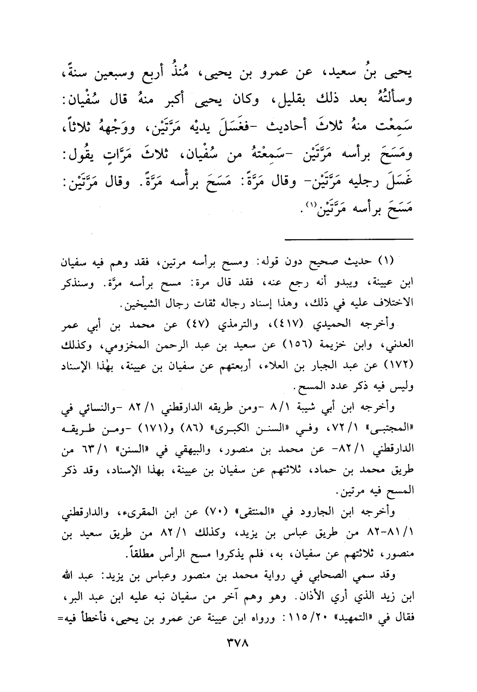 يَحْيَى بْنُ سَعِيدٍ، عَنْ عَمْرِو بْنِ يَحْيَى - مُنْذُ أَرْبَعٍ وَسَبْعِينَ سَنَةً، وَسَأَلْتُهُ بَعْدَ ذَلِكَ بِقَلِيلٍ، وَكَانَ يَحْيَى أَكْبَرَ مِنْهُ، قَالَ سُفْيَانُ: سَمِعْتُ مِنْهُ ثَلَاثَةَ أَحَادِيثَ - " فَغَسَلَ يَدَيْهِ مَرَّتَيْنِ، وَوَجْهَهُ ثَلَاثًا، وَمَسَحَ بِرَأْسِهِ مَرَّتَيْنِ "، سَمِعْتُهُ مِنْ سُفْيَانَ ثَلَاثَ مَرَّاتٍ يَقُولُ: غَسَلَ رِجْلَيْهِ مَرَّتَيْنِ، وَقَالَ مَرَّةً: " مَسَحَ بِرَأْسِهِ مَرَّةً " وَقَالَ مَرَّتَيْنِ: " مَسَحَ بِرَأْسِهِ مَرَّتَيْنِ " (١)