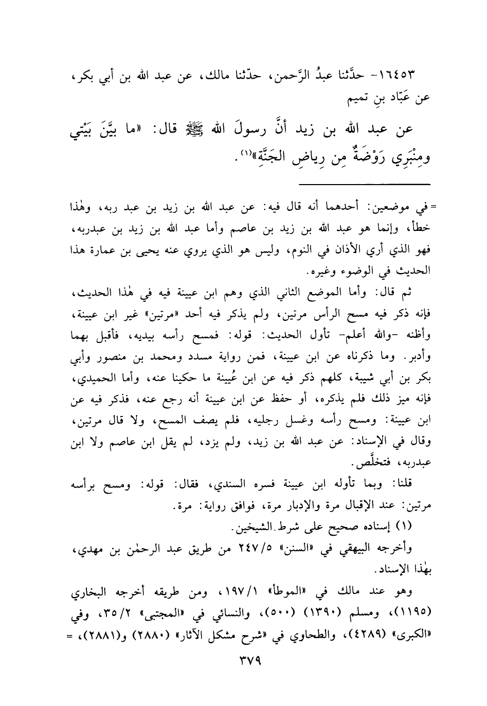 ثم قال: وأما الموضع الثاني الذي وهم ابن عيينة فيه في هذا الحديث، فإنه ذكر فيه مسح الرأس مرتين، ولم يذكر فيه أحد "مرتين" غير ابن عيينة، وأظنه- والله أعلم- تأول الحديث: قوله: فمسح رأسه بيديه، فأقبل بهما وأدبر. وما ذكرناه عن ابن عيينة، فمن رواية مسدد ومحمد بن منصور وأبي