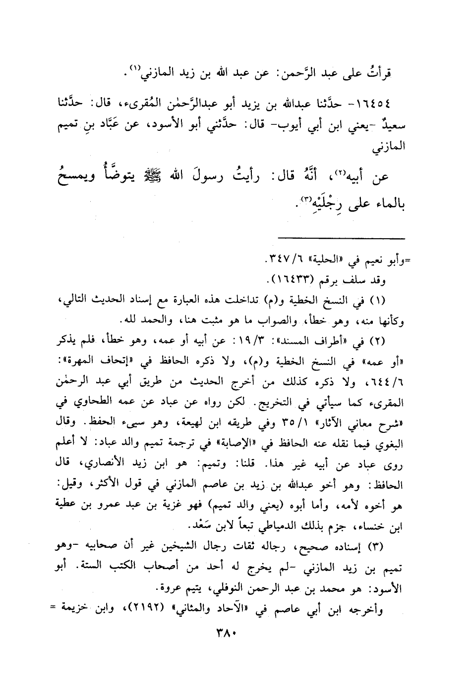 ١٦٤٥٤ - حَدَّثَنَا عَبْدُ اللهِ بْنُ يَزِيدَ أَبُو عَبْدِ الرَّحْمَنِ الْمُقْرِئُ، قَالَ: حَدَّثَنَا سَعِيدٌ يَعْنِي ابْنَ أَبِي أَيُّوبَ، قَالَ: حَدَّثَنِي أَبُو الْأَسْوَدِ، عَنْ عَبَّادِ بْنِ تَمِيمٍ الْمَازِنِيِّ، عَنْ أَبِيهِ (٢) أَنَّهُ قَالَ: " رَأَيْتُ رَسُولَ اللهِ صَلَّى اللهُ عَلَيْهِ وَسَلَّمَ يَتَوَضَّأُ وَيَمْسَحُ بِالْمَاءِ عَلَى رِجْلَيْهِ " (٣)