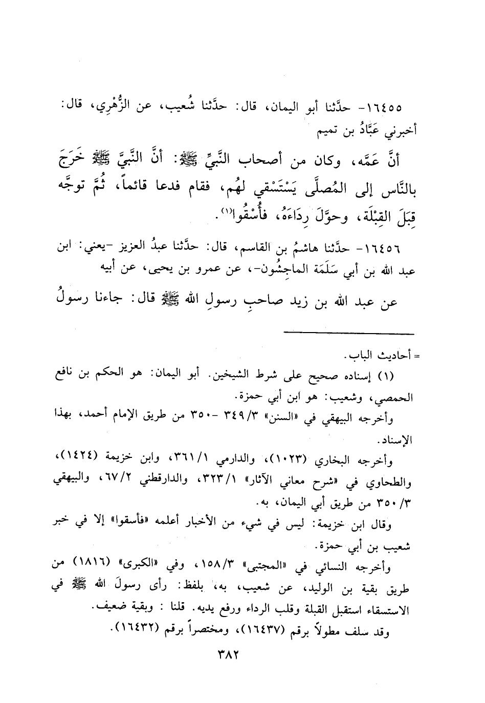 ١٦٤٥٥ - حَدَّثَنَا أَبُو الْيَمَانِ، قَالَ: حَدَّثَنَا شُعَيْبٌ، عَنِ الزُّهْرِيِّ قَالَ: أَخْبَرَنِي عَبَّادُ بْنُ تَمِيمٍ، أَنَّ عَمَّهُ وَكَانَ مِنْ أَصْحَابِ النَّبِيِّ صَلَّى اللهُ عَلَيْهِ وَسَلَّمَ، " أَنَّ النَّبِيَّ صَلَّى اللهُ عَلَيْهِ وَسَلَّمَ خَرَجَ بِالنَّاسِ إِلَى الْمُصَلَّى يَسْتَسْقِي لَهُمْ، فَقَامَ فَدَعَا قَائِمًا، ثُمَّ تَوَجَّهَ قِبَلَ الْقِبْلَةِ وَحَوَّلَ رِدَاءَهُ "، فَأُسْقُوا (١)