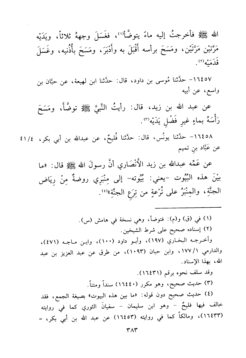 ١٦٤٥٧ - حَدَّثَنَا مُوسَى بْنُ دَاوُدَ، قَالَ: حَدَّثَنَا ابْنُ لَهِيعَةَ، عَنْ حَبَّانَ بْنِ وَاسِعٍ، عَنْ أَبِيهِ، عَنْ عَبْدِ اللهِ بْنِ زَيْدٍ قَالَ: " رَأَيْتُ النَّبِيَّ صَلَّى اللهُ عَلَيْهِ وَسَلَّمَ تَوَضَّأَ وَمَسَحَ رَأْسَهُ بِمَاءٍ غَيْرِ فَضْلِ يَدَيْهِ " (٣)