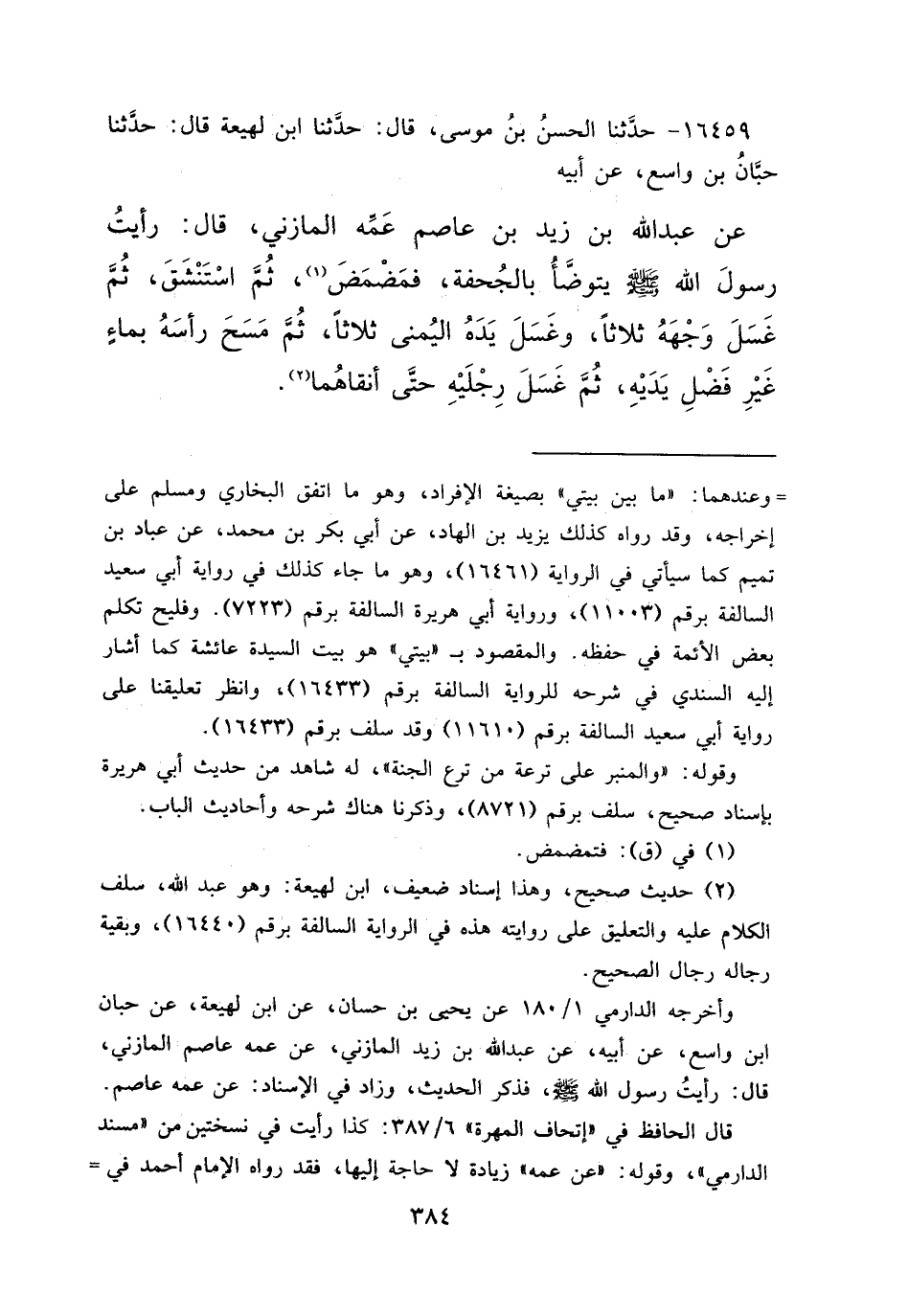 ١٦٤٥٩ - حَدَّثَنَا الْحَسَنُ بْنُ مُوسَى، قَالَ: حَدَّثَنَا ابْنُ لَهِيعَةَ، قَالَ: حَدَّثَنَا حَبَّانُ بْنُ وَاسِعٍ، عَنْ أَبِيهِ، عَنْ عَبْدِ اللهِ بْنِ زَيْدِ بْنِ عَاصِمٍ عَمُّهُ الْمَازِنِيُّ قَالَ: " رَأَيْتُ رَسُولَ اللهِ صَلَّى اللهُ عَلَيْهِ وَسَلَّمَ يَتَوَضَّأُ بِالْجُحْفَةِ فَمَضْمَضَ، (١) ثُمَّ اسْتَنْشَقَ، ثُمَّ غَسَلَ وَجْهَهُ ثَلَاثًا، وَغَسَلَ يَدَهُ الْيُمْنَى ثَلَاثًا، ثُمَّ مَسَحَ رَأْسَهُ بِمَاءٍ غَيْرِ فَضْلِ يَدَيْهِ، ثُمَّ غَسَلَ رِجْلَيْهِ حَتَّى أَنْقَاهُمَا " (٢)
