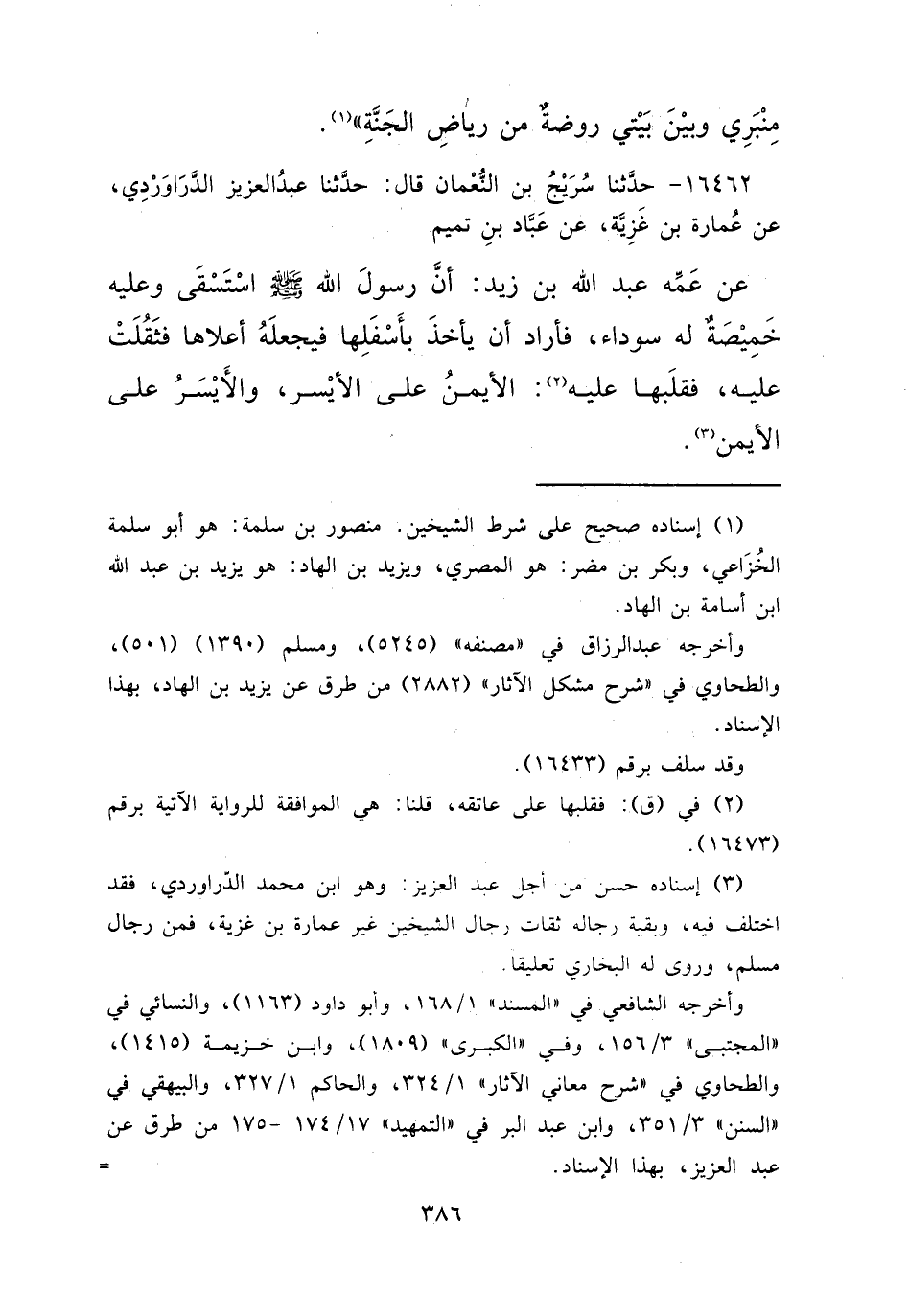 ١٦٤٦٢ - حَدَّثَنَا سُرَيْجُ بْنُ النُّعْمَانِ، قَالَ: حَدَّثَنَا عَبْدُ الْعَزِيزِ الدَّرَاوَرْدِيُّ، عَنْ عُمَارَةَ بنِ غَزِيَّةَ، عَنْ عَبَّادِ بْنِ تَمِيمٍ، عَنْ عَمِّهِ عَبْدِ اللهِ بْنِ زَيْدٍ، " أَنَّ رَسُولَ اللهِ صَلَّى اللهُ عَلَيْهِ وَسَلَّمَ اسْتَسْقَى وَعَلَيْهِ خَمِيصَةٌ لَهُ سَوْدَاءُ، فَأَرَادَ أَنْ يَأْخُذَ بِأَسْفَلِهَا فَيَجْعَلَهُ أَعْلَاهَا، فَثَقُلَتْ عَلَيْهِ فَقَلَبَهَا عَلَيْهِ (٢) الْأَيْمَنُ عَلَى الْأَيْسَرِ، وَالْأَيْسَرُ عَلَى الْأَيْمَنِ " (٣)