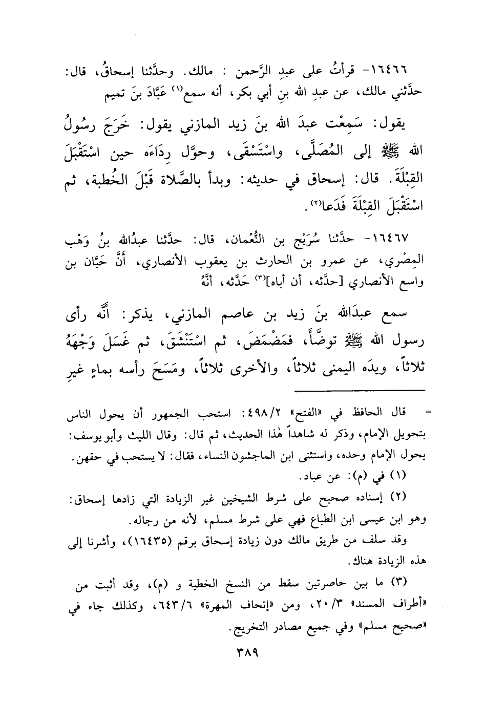 ١٦٤٦٧ - حَدَّثَنَا سُرَيْجُ بْنُ النُّعْمَانِ، قَالَ: حَدَّثَنَا عَبْدُ اللهِ بْنُ وَهْبٍ الْمِصْرِيُّ، عَنْ عَمْرِو بْنِ الْحَارِثِ بْنِ يَعْقُوبَ الْأَنْصَارِيِّ، أَنَّ حَبَّانَ بْنَ وَاسِعٍ الْأَنْصَارِيَّ حَدَّثَهُ أَنَّ أَبَاهُ، (٣) حَدَّثَهُ، أَنَّهُ سَمِعَ عَبْدَ اللهِ بْنَ زَيْدِ بْنِ عَاصِمٍ الْمَازِنِيَّ يَذْكُرُ، أَنَّهُ " رَأَى رَسُولَ اللهِ صَلَّى اللهُ عَلَيْهِ وَسَلَّمَ تَوَضَّأَ فَمَضْمَضَ، ثُمَّ اسْتَنْشَقَ، ثُمَّ غَسَلَ وَجْهَهُ ثَلَاثًا، وَيَدَهُ الْيُمْنَى ثَلَاثًا، وَالْأُخْرَى ثَلَاثًا، وَمَسَحَ رَأْسَهُ بِمَاءٍ غَيْرِ