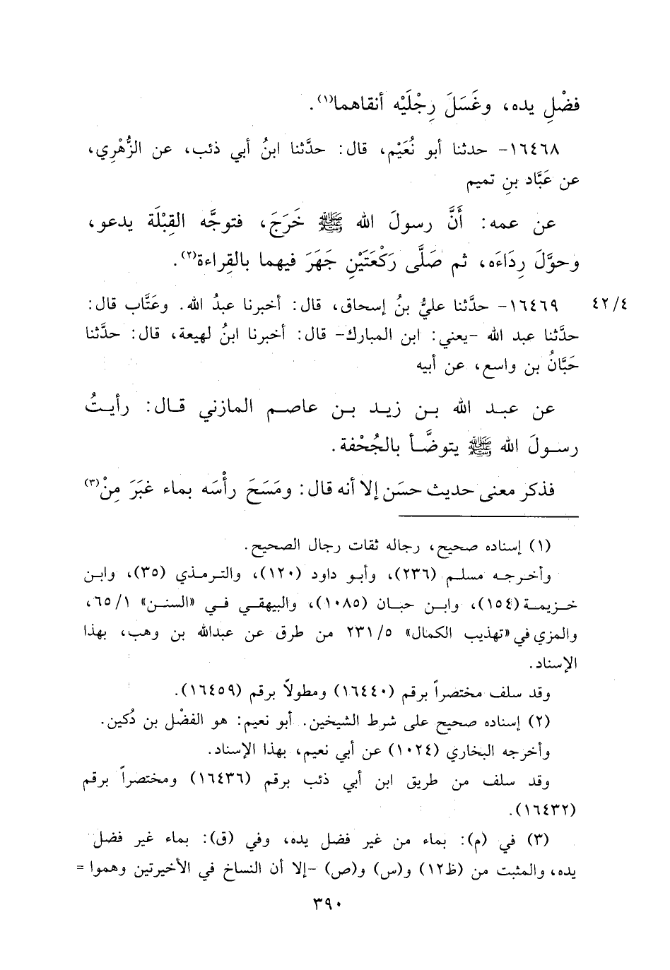 ١٦٤٦٩ - حَدَّثَنَا عَلِيُّ بْنُ إِسْحَاقَ، قَالَ: أَخْبَرَنَا عَبْدُ اللهِ، وَعَتَّابٌ قَالَ: حَدَّثَنَا عَبْدُ اللهِ يَعْنِي ابْنَ الْمُبَارَكِ، قَالَ: أَخْبَرَنَا ابْنُ لَهِيعَةَ قَالَ: حَدَّثَنَا حَبَّانُ بْنُ وَاسِعٍ، عَنْ أَبِيهِ، عَنْ عَبْدِ اللهِ بْنِ زَيْدِ بْنِ عَاصِمٍ الْمَازِنِيِّ قَالَ: " رَأَيْتُ رَسُولَ اللهِ صَلَّى اللهُ عَلَيْهِ وَسَلَّمَ يَتَوَضَّأُ بِالْجُحْفَةِ ـ فَذَكَرَ مَعْنَى حَدِيثِ حَسَنٍ إِلَّا أَنَّهُ قَالَ: وَمَسَحَ رَأْسَهُ بِمَاءٍ غَبْرٍ مِنْ (٣)