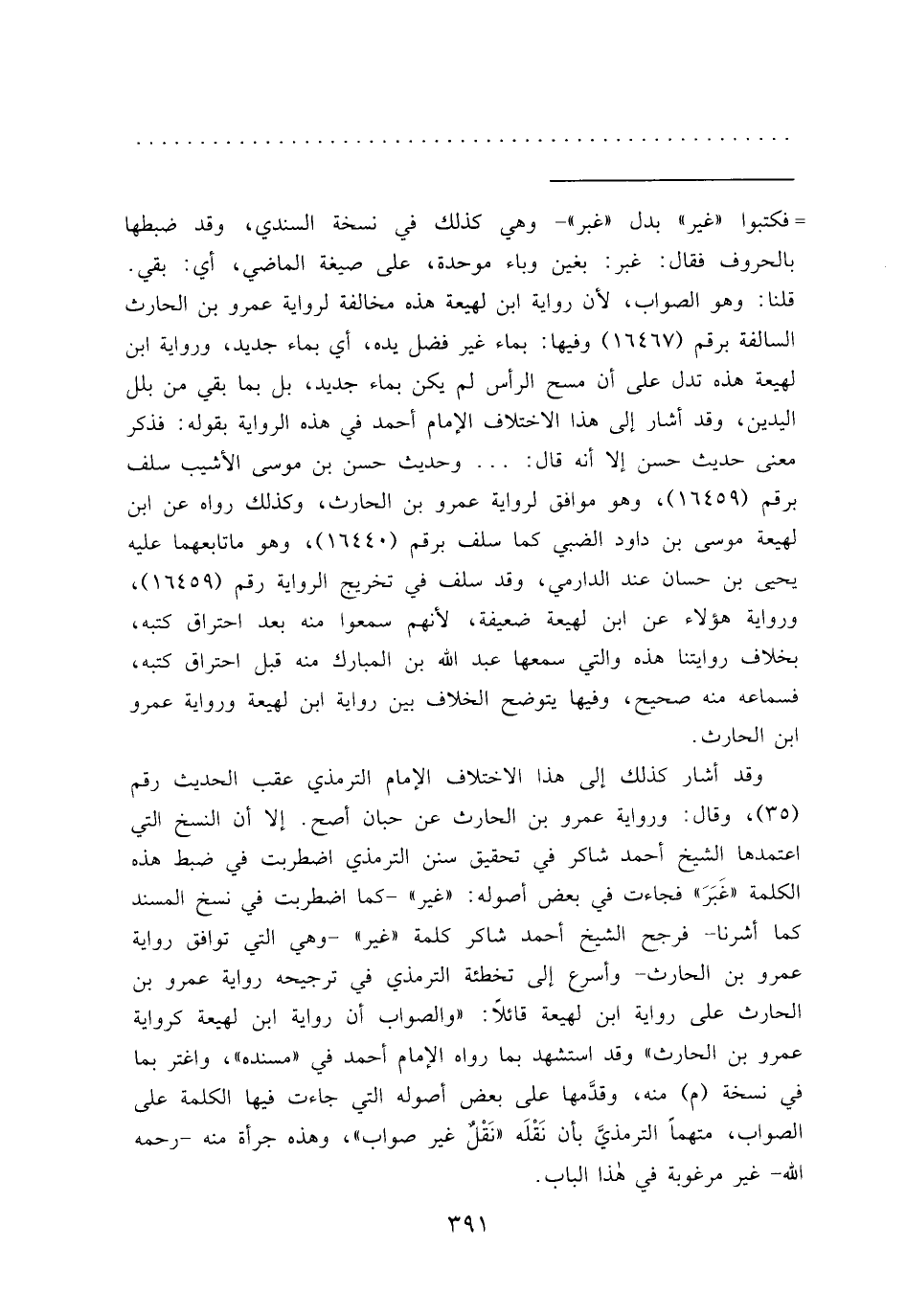وقد أشار كذلك إلى هذا الاختلاف الإمام الترمذي عقب الحديث رقم (٣٥) ، وقال: ورواية عمرو بن الحارث عن حبان أصح. إلا أن النسخ التي اعتمدها الشيخ أحمد شاكر في تحقيق سنن الترمذي اضطربت في ضبط هذه الكلمة "غَبَرَ" فجاءت في بعض أصوله: "غير"- كما اضطربت في نسخ المسند كما أشرنا- فرجح الشيخ أحمد شاكر كلمة "غير"- وهي التي توافق رواية عمرو بن الحارث- وأسرع إلى تخطئة الترمذي في ترجيحه رواية عمرو بن الحارث على رواية ابن لهيعة قائلاً: "والصواب أن رواية ابن لهيعة كرواية عمرو بن الحارث " وقد استشهد بما رواه الإمام أحمد في "مسنده"، واغتر بما في نسخة (م) منه، وقدَّمها على بعض أصوله التي جاءت فيها الكلمة على
