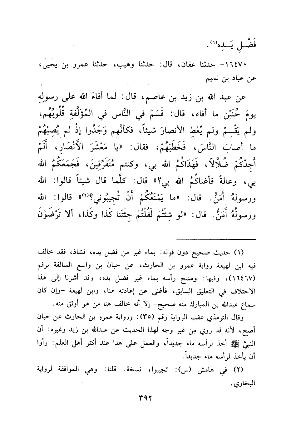 ١٦٤٧٠ - حَدَّثَنَا عَفَّانُ، قَالَ: حَدَّثَنَا وُهَيْبٌ، حَدَّثَنَا عَمْرُو بْنُ يَحْيَى، عَنْ عَبَّادِ بْنِ تَمِيمٍ، عَنْ عَبْدِ اللهِ بْنِ زَيْدِ بْنِ عَاصِمٍ قَالَ: لَمَّا أَفَاءَ اللهُ عَلَى رَسُولِهِ يَوْمَ حُنَيْنٍ مَا أَفَاءَ، قَالَ: قَسَمَ فِي النَّاسِ فِي الْمُؤَلَّفَةِ قُلُوبُهُمْ وَلَمْ يَقْسِمْ وَلَمْ يُعْطِ الْأَنْصَارَ شَيْئًا، فَكَأَنَّهُمْ وَجَدُوا إِذْ لَمْ يُصِبْهُمْ مَا أَصَابَ النَّاسَ فَخَطَبَهُمْ فَقَالَ: " يَا مَعْشَرَ الْأَنْصَارِ، أَلَمْ أَجِدْكُمْ ضُلَّالًا فَهَدَاكُمُ اللهُ بِي، وَكُنْتُمْ مُتَفَرِّقِينَ فَجَمَعَكُمُ اللهُ بِي، وَعَالَةً فَأَغْنَاكُمُ اللهُ بِي "، قَالَ: كُلَّمَا قَالَ شَيْئًا قَالُوا: اللهُ وَرَسُولُهُ أَمَنُّ، قَالَ: " مَا يَمْنَعُكُمْ أَنْ تُجِيبُونِي؟ (٢) "، قَالُوا: اللهُ وَرَسُولُهُ أَمَنُّ، قَالَ: " لَوْ شِئْتُمْ لَقُلْتُمْ جِئْتَنَا كَذَا وَكَذَا، أَلَا تَرْضَوْنَ