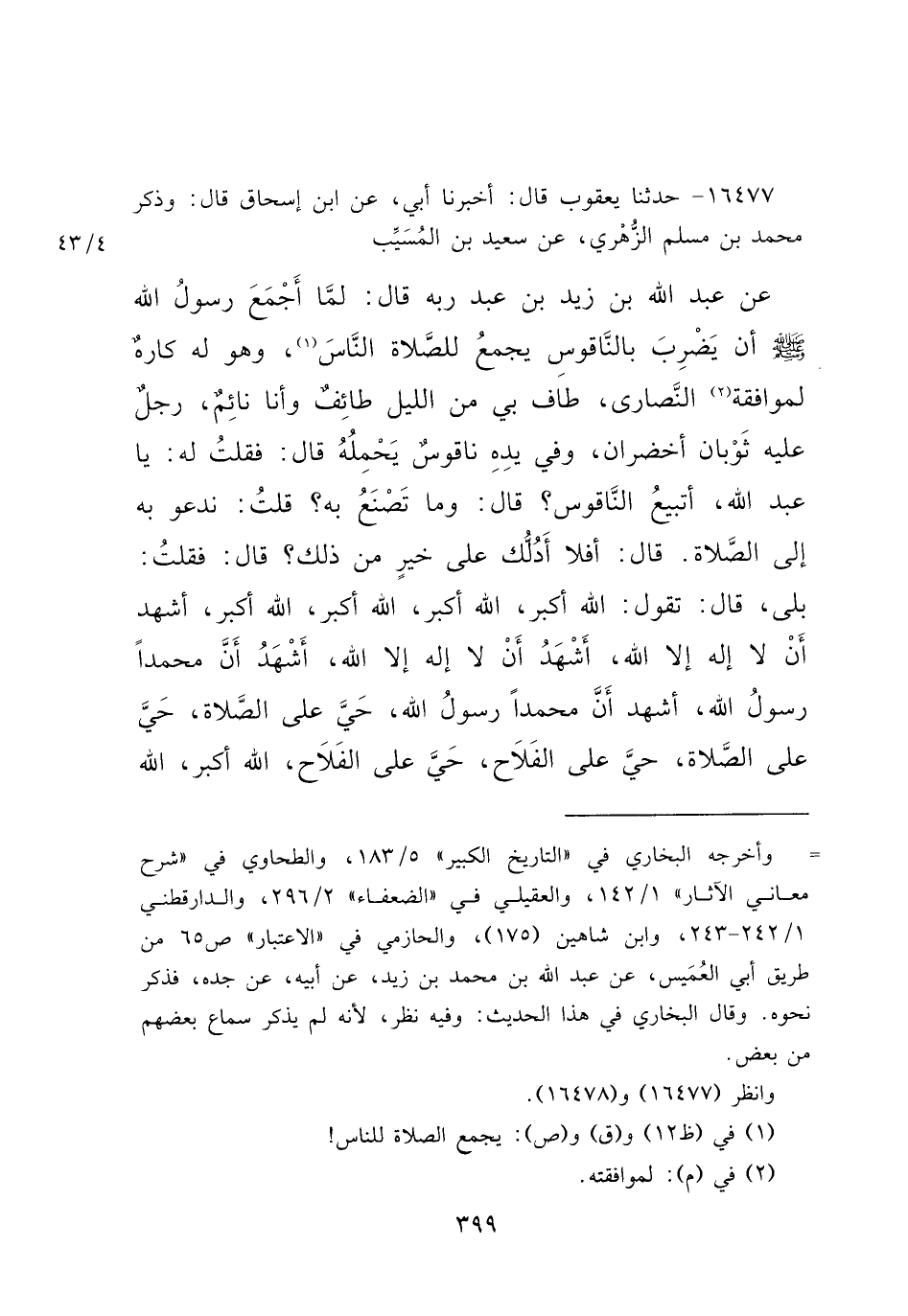 ١٦٤٧٧ - حَدَّثَنَا يَعْقُوبُ، قَالَ: أَخْبَرَنَا أَبِي، عَنِ ابْنِ إِسْحَاقَ قَالَ: وَذَكَرَ مُحَمَّدُ بْنُ مُسْلِمٍ الزُّهْرِيُّ، عَنْ سَعِيدِ بْنِ الْمُسَيِّبِ، عَنْ عَبْدِ اللهِ بْنِ زَيْدِ بْنِ عَبْدِ رَبِّهِ قَالَ: لَمَّا أَجْمَعَ رَسُولُ اللهِ صَلَّى اللهُ عَلَيْهِ وَسَلَّمَ أَنْ يَضْرِبَ بِالنَّاقُوسِ يَجْمَعُ لِلصَّلَاةِ النَّاسَ، (١) وَهُوَ لَهُ كَارِهٌ لِمُوَافَقَتِهِ (٢) النَّصَارَى، طَافَ بِي مِنَ اللَّيْلِ طَائِفٌ وَأَنَا نَائِمٌ، رَجُلٌ عَلَيْهِ ثَوْبَانِ أَخْضَرَانِ وَفِي يَدِهِ نَاقُوسٌ يَحْمِلُهُ، قَالَ: فَقُلْتُ لَهُ: يَا عَبْدَ اللهِ أَتَبِيعُ النَّاقُوسَ، قَالَ: وَمَا تَصْنَعُ بِهِ؟ قُلْتُ: نَدْعُو بِهِ إِلَى الصَّلَاةِ، قَالَ: أَفَلَا أَدُلُّكَ عَلَى خَيْرٍ مِنْ ذَلِكَ؟ قَالَ: فَقُلْتُ: بَلَى، قَالَ: تَقُولُ اللهُ أَكْبَرُ اللهُ أَكْبَرُ، اللهُ أَكْبَرُ اللهُ أَكْبَرُ، أَشْهَدُ أَنْ لَا إِلَهَ إِلَّا اللهُ، أَشْهَدُ أَنْ لَا إِلَهَ إِلَّا اللهُ، أَشْهَدُ أَنَّ مُحَمَّدًا رَسُولُ اللهِ، أَشْهَدُ أَنَّ مُحَمَّدًا رَسُولُ اللهِ، حَيَّ عَلَى الصَّلَاةِ، حَيَّ عَلَى الصَّلَاةِ، حَيَّ عَلَى الْفَلَاحِ، حَيَّ عَلَى الْفَلَاحِ، اللهُ أَكْبَرُ اللهُ