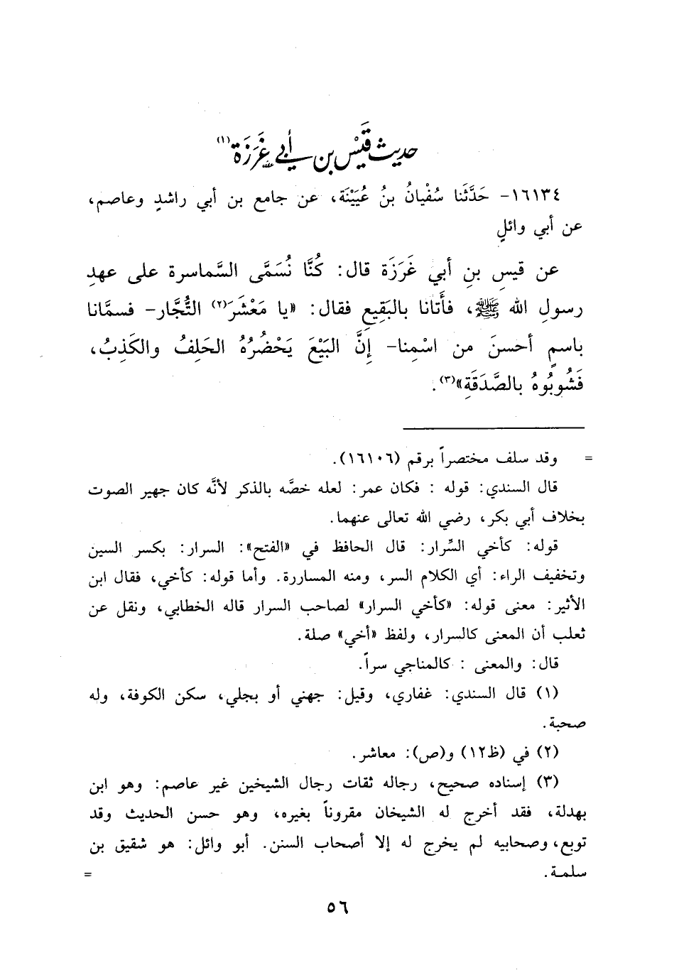 ١٦١٣٤ - حَدَّثَنَا سُفْيَانُ بْنُ عُيَيْنَةَ، عَنْ جَامِعِ بْنِ أَبِي رَاشِدٍ، وَعَاصِمٍ، عَنْ أَبِي وَائِلٍ، عَنْ قَيْسِ بْنِ أَبِي غَرَزَةَ، قَالَ: كُنَّا نُسَمَّى السَّمَاسِرَةَ عَلَى عَهْدِ رَسُولِ اللهِ صَلَّى اللهُ عَلَيْهِ وَسَلَّمَ، فَأَتَانَا بِالْبَقِيعِ فَقَالَ: " يَا مَعْشَرَ (٢) التُّجَّارِ - فَسَمَّانَا بِاسْمٍ أَحْسَنَ مِنْ اسْمِنَا - إِنَّ الْبَيْعَ يَحْضُرُهُ الْحَلِفُ، وَالْكَذِبُ، فَشُوبُوهُ بِالصَّدَقَةِ " (٣)