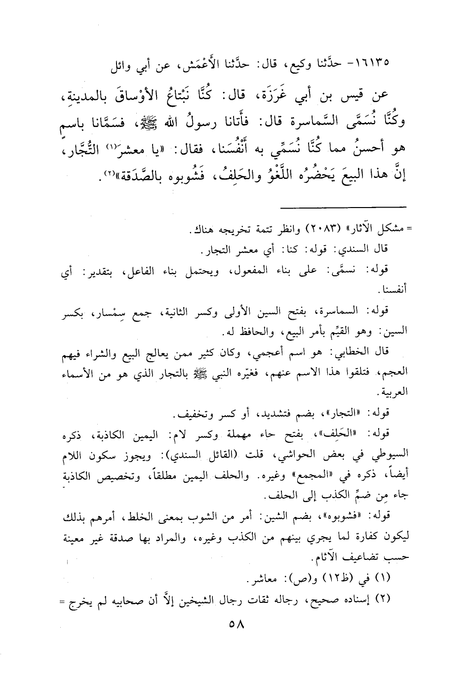 ١٦١٣٥ - حَدَّثَنَا وَكِيعٌ، قَالَ: حَدَّثَنَا الْأَعْمَشُ، عَنْ أَبِي وَائِلٍ، عَنْ قَيْسِ بْنِ أَبِي غَرَزَةَ، قَالَ: كُنَّا نَبْتَاعُ الْأَوْسَاقَ بِالْمَدِينَةِ، وَكُنَّا نُسَمَّى السَّمَاسِرَةَ، قَالَ: فَأَتَانَا رَسُولُ اللهِ صَلَّى اللهُ عَلَيْهِ وَسَلَّمَ فَسَمَّانَا بِاسْمٍ هُوَ أَحْسَنُ مِمَّا كُنَّا نُسَمِّي بِهِ أَنْفُسَنَا، فَقَالَ: " يَا مَعْشَرَ (١) التُّجَّارِ إِنَّ هَذَا الْبَيْعَ يَحْضُرُهُ اللَّغْوُ، وَالْحَلِفُ، فَشُوبُوهُ بِالصَّدَقَةِ " (٢)