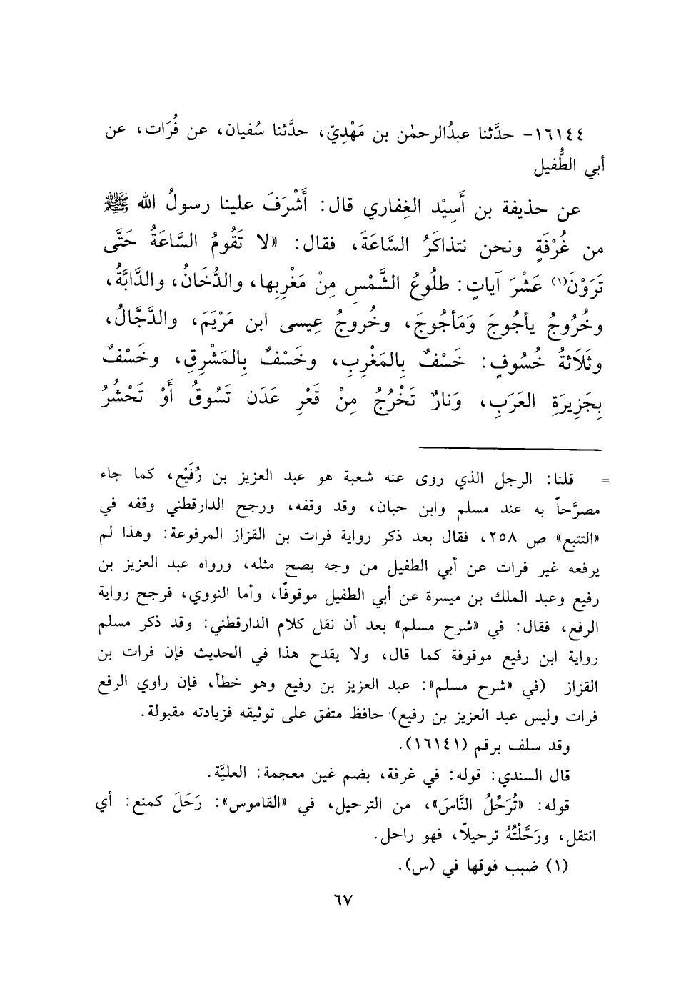 ١٦١٤٤ - حَدَّثَنَا عَبْدُ الرَّحْمَنِ بْنُ مَهْدِيٍّ، حَدَّثَنَا سُفْيَانُ، عَنْ فُرَاتٍ، عَنْ أَبِي الطُّفَيْلِ، عَنْ حُذَيْفَةَ بْنِ أَسِيدٍ الْغِفَارِيِّ، قَالَ: أَشْرَفَ عَلَيْنَا رَسُولُ اللهِ صَلَّى اللهُ عَلَيْهِ وَسَلَّمَ مِنْ غُرْفَةٍ وَنَحْنُ نَتَذَاكَرُ السَّاعَةَ، فَقَالَ: " لَا تَقُومُ السَّاعَةُ حَتَّى تَرَوْنَ (١) عَشْرَ آيَاتٍ: طُلُوعُ الشَّمْسِ مِنْ مَغْرِبِهَا، وَالدُّخَانُ، وَالدَّابَّةُ، وَخُرُوجُ يَأْجُوجَ، وَمَأْجُوجَ، وَخُرُوجُ عِيسَى ابْنِ مَرْيَمَ وَالدَّجَّالِ، وَثَلَاثُ خُسُوفٍ: خَسْفٌ بِالْمَغْرِبِ، وَخَسْفٌ بِالْمَشْرِقِ، وَخَسْفٌ بِجَزِيرَةِ الْعَرَبِ، وَنَارٌ تَخْرُجُ مِنْ قَعْرِ عَدَنٍ تَسُوقُ - أَوْ تَحْشُرُ