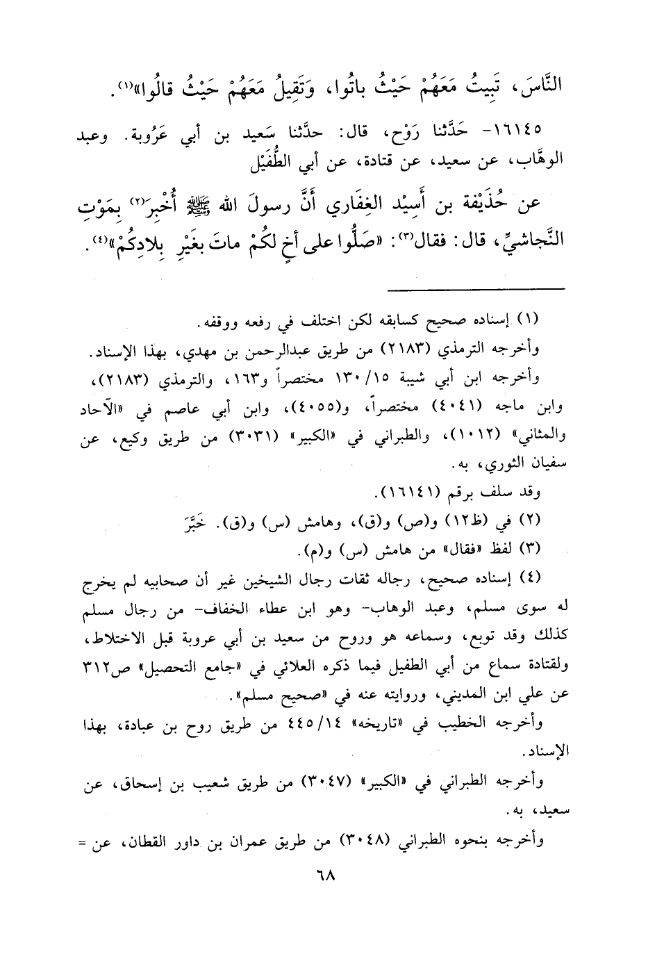 ١٦١٤٥ - حَدَّثَنَا رَوْحٌ، قَالَ: حَدَّثَنَا سَعِيدُ بْنُ أَبِي عَرُوبَةَ، وَعَبْدُ الْوَهَّابِ، عَنْ سَعِيدٍ، عَنْ قَتَادَةَ، عَنْ أَبِي الطُّفَيْلِ، عَنْ حُذَيْفَةَ بْنِ أَسِيدٍ الْغِفَارِيِّ، أَنَّ رَسُولَ اللهِ صَلَّى اللهُ عَلَيْهِ وَسَلَّمَ أَخْبَرَ (٢) بِمَوْتِ النَّجَاشِيِّ، قَالَ: فَقَالَ (٣) : " صَلُّوا عَلَى أَخٍ لَكُمْ بِغَيْرِ بِلَادِكُمْ " (٤)