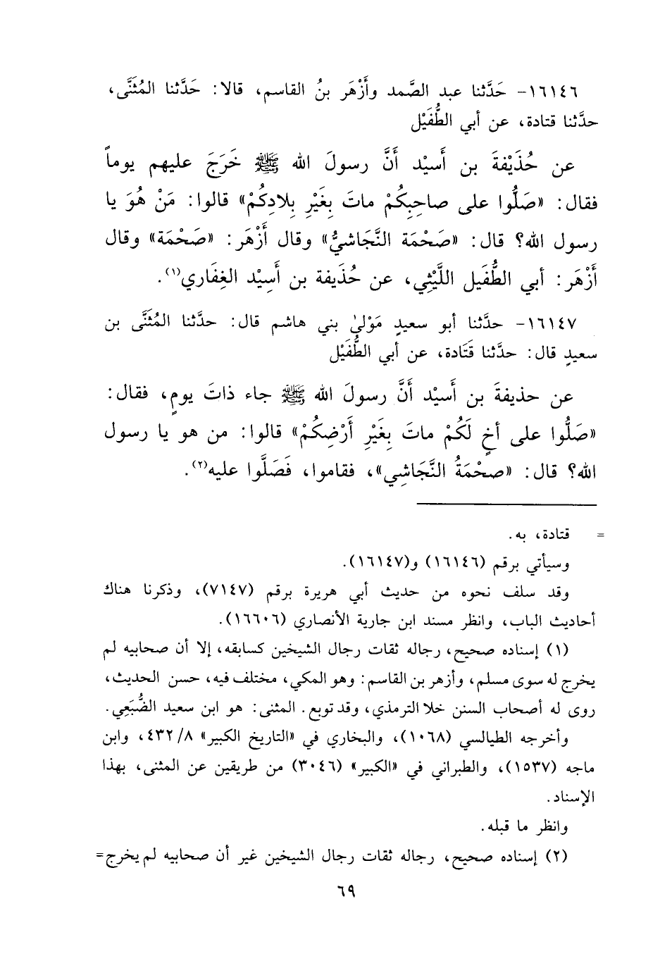 ١٦١٤٦ - حَدَّثَنَا عَبْدُ الصَّمَدِ، وَأَزْهَرُ بْنُ الْقَاسِمِ، قَالَا: حَدَّثَنَا الْمُثَنَّى، حَدَّثَنَا قَتَادَةُ، عَنْ أَبِي الطُّفَيْلِ، عَنْ حُذَيْفَةَ بْنِ أَسِيدٍ، أَنَّ رَسُولَ اللهِ صَلَّى اللهُ عَلَيْهِ وَسَلَّمَ خَرَجَ عَلَيْهِمْ يَوْمًا فَقَالَ: " صَلُّوا عَلَى صَاحِبِكُمْ، مَاتَ بِغَيْرِ بِلَادِكُمْ " قَالُوا: مَنْ هُوَ يَا رَسُولَ اللهِ؟ " قَالَ: " صُحْمَةُ النَّجَاشِيُّ " وَقَالَ أَزْهَرُ: " صَحْمَةُ "، وَقَالَ أَزْهَرُ: أَبِي الطُّفَيْلِ اللَّيْثِيِّ، عَنْ حُذَيْفَةَ بْنِ أَسِيدٍ الْغِفَارِيِّ (١)
