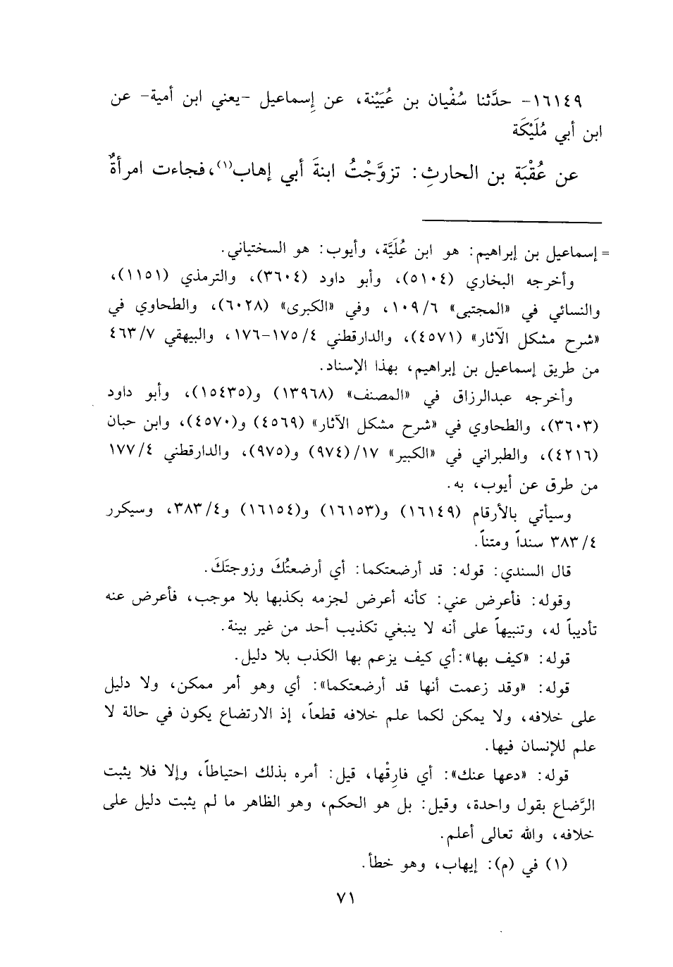 ١٦١٤٩ - حَدَّثَنَا سُفْيَانُ بْنُ عُيَيْنَةَ، عَنْ إِسْمَاعِيلَ يَعْنِي ابْنَ أُمَيَّةَ، عَنِ ابْنِ أَبِي مُلَيْكَةَ، عَنْ عُقْبَةَ بْنِ الْحَارِثِ، تَزَوَّجْتُ ابْنَةَ أَبِي إِهَابٍ (١) ، فَجَاءَتْ امْرَأَةٌ