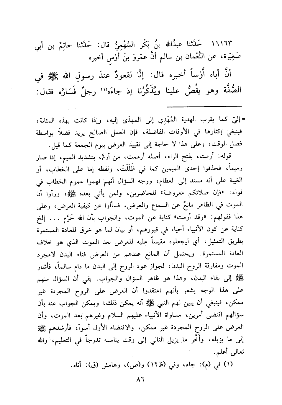 ١٦١٦٣ - حَدَّثَنَا عَبْدُ اللهِ بْنُ بَكْرٍ السَّهْمِيُّ، قَالَ: حَدَّثَنَا حَاتِمُ بْنُ أَبِي صَغِيرَةَ، عَنِ النُّعْمَانِ بْنِ سَالِمٍ، أَنَّ عَمْرَو بْنَ أَوْسٍ، أَخْبَرَهُ أَنَّ أَبَاهُ أَوْسًا أَخْبَرَهُ، قَالَ: إِنَّا لَقُعُودٌ عِنْدَ رَسُولِ اللهِ صَلَّى اللهُ عَلَيْهِ وَسَلَّمَ فِي الصُّفَّةِ، وَهُوَ يَقُصُّ عَلَيْنَا وَيُذَكِّرُنَا إِذْ جَاءَهُ (١) رَجُلٌ فَسَارَّهُ، فَقَالَ: "