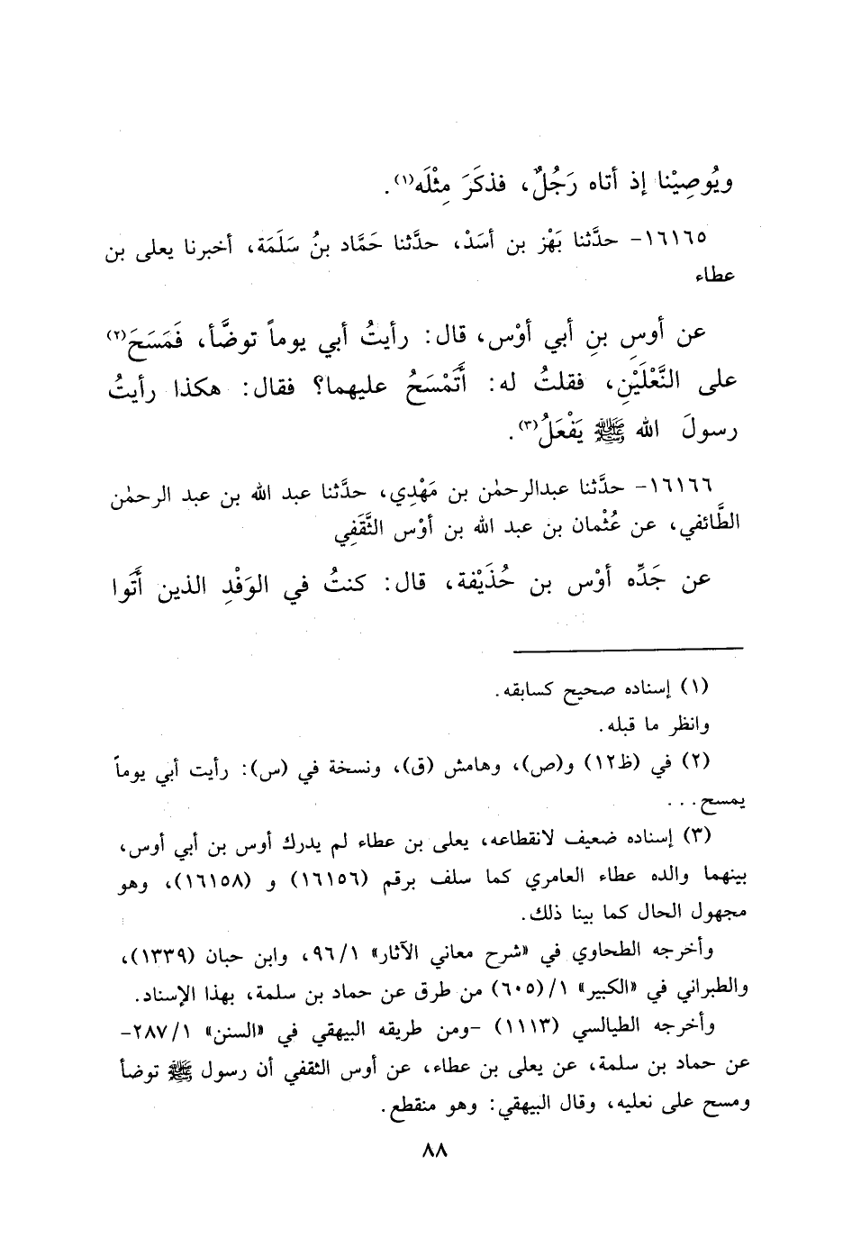 ١٦١٦٥ - حَدَّثَنَا بَهْزُ بْنُ أَسَدٍ، حَدَّثَنَا حَمَّادُ بْنُ سَلَمَةَ، أَخْبَرَنَا يَعْلَى بْنُ عَطَاءٍ، عَنْ أَوْسِ بْنِ أَبِي أَوْسٍ، قَالَ: رَأَيْتُ أَبِي يَوْمًا " تَوَضَّأَ فَمَسَحَ (٢) على النَّعْلَيْنِ " فَقُلْتُ لَهُ: أَتَمْسَحُ عَلَيْهِمَا؟ فَقَالَ: " هَكَذَا رَأَيْتُ رَسُولَ اللهِ صَلَّى اللهُ عَلَيْهِ وَسَلَّمَ يَفْعَلُ " (٣)