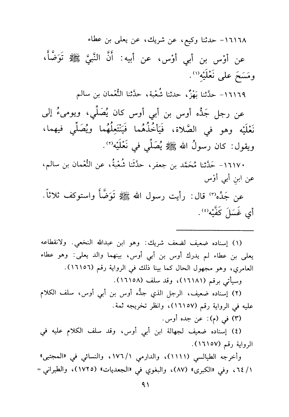 ١٦١٦٨ - حَدَّثَنَا وَكِيعٌ، عَنْ شَرِيكٍ، عَنْ يَعْلَى بْنِ عَطَاءٍ، عَنْ أَوْسِ بْنِ أَبِي أَوْسٍ، عَنْ أَبِيهِ، " أَنَّ النَّبِيَّ صَلَّى اللهُ عَلَيْهِ وَسَلَّمَ تَوَضَّأَ وَمَسَحَ عَلَى نَعْلَيْهِ " (١)