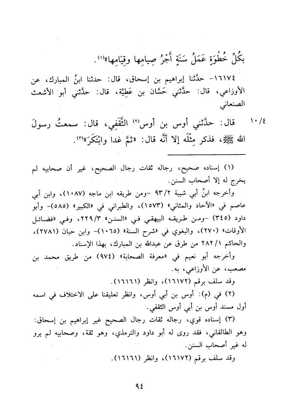 ١٦١٧٤ - حَدَّثَنَا إِبْرَاهِيمُ بْنُ إِسْحَاقَ، قَالَ: حَدَّثَنَا ابْنُ الْمُبَارَكِ، عَنِ الْأَوْزَاعِيِّ، قَالَ: حَدَّثَنِي حَسَّانُ بْنُ عَطِيَّةَ، قَالَ: حَدَّثَنِي أَبُو الْأَشْعَثِ الصَّنْعَانِيُّ، قَالَ: حَدَّثَنِي أَوْسُ بْنُ أَوْسٍ (٢) الثَّقَفِيُّ، قَالَ: سَمِعْتُ رَسُولَ اللهِ صَلَّى اللهُ عَلَيْهِ وَسَلَّمَ، فَذَكَرَ مِثْلَهُ إِلَّا أَنَّهُ قَالَ: " ثُمَّ غَدَا وَابْتَكَرَ " (٣)