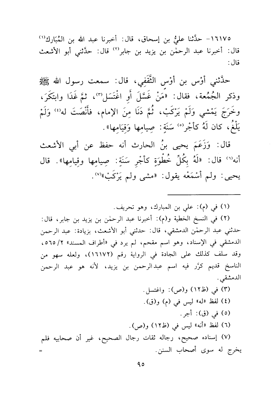 ١٦١٧٥ - حَدَّثَنَا عَلِيُّ بْنُ إِسْحَاقَ، قَالَ: أَخْبَرَنَا عَبْدُ اللهِ بْنُ الْمُبَارَكِ (١) ، قَالَ: أَخْبَرَنَا عَبْدُ الرَّحْمَنِ بْنُ يَزِيدَ بْنِ جَابِرٍ (٢) ، قَالَ: حَدَّثَنِي أَبُو الْأَشْعَثِ، قَالَ: حَدَّثَنِي أَوْسُ بْنُ أَوْسٍ الثَّقَفِيُّ، قَالَ: سَمِعْتُ رَسُولَ اللهِ صَلَّى اللهُ عَلَيْهِ وَسَلَّمَ وَذَكَرَ الْجُمُعَةَ، فَقَالَ: " مَنْ غَسَّلَ أوِ اغْتَسَلَ (٣) ، ثُمَّ غَدَا وَابْتَكَرَ، وَخَرَجَ يَمْشِي وَلَمْ يَرْكَبْ، ثُمَّ دَنَا مِنَ الْإِمَامِ، فَأَنْصَتَ لَهُ (٤) وَلَمْ يَلْغُ، كَانَ لَهُ كَأَجْرِ (٥) سَنَةٍ صِيَامِهَا وَقِيَامِهَا " قَالَ: وَزَعَمَ يَحْيَى بْنُ الْحَارِثِ أَنَّهُ حَفِظَ، عَنْ أَبِي الْأَشْعَثِ أَنَّهُ (٦) قَالَ لَهُ: " بِكُلِّ خُطْوَةٍ كَأَجْرِ سَنَةٍ صِيَامِهَا وَقِيَامِهَا " قَالَ يَحْيَى: " وَلَمْ أَسْمَعْهُ يَقُولُ: مَشَى وَلَمْ يَرْكَبْ " (٧)