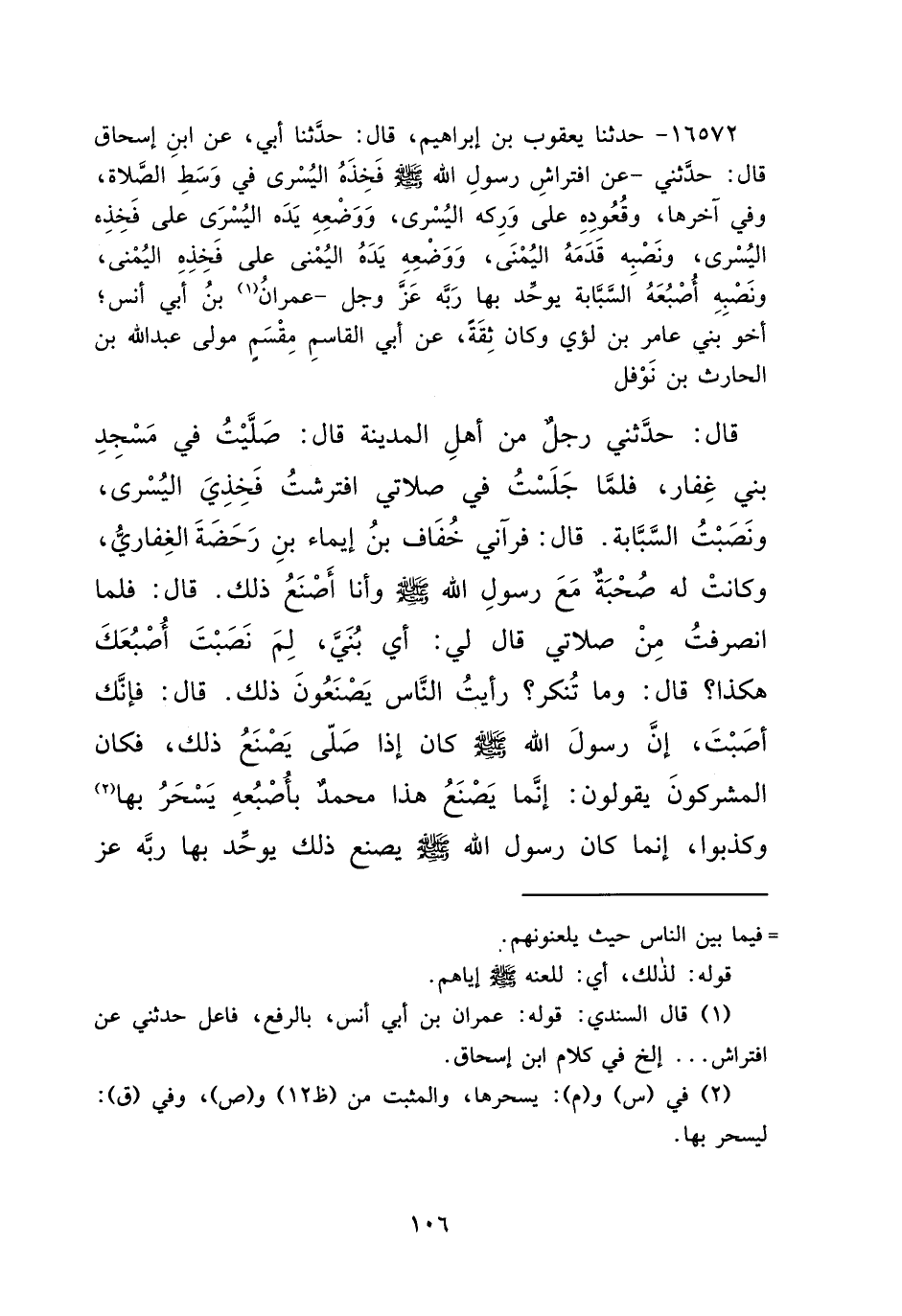 ١٦٥٧٢ - حَدَّثَنَا يَعْقُوبُ بْنُ إِبْرَاهِيمَ، قَالَ: حَدَّثَنَا أَبِي، عَنِ ابْنِ إِسْحَاقَ قَالَ: حَدَّثْنِي عَنْ افْتِرَاشِ رَسُولِ اللهِ صَلَّى اللهُ عَلَيْهِ وَسَلَّمَ فَخِذَهُ الْيُسْرَى فِي وَسَطِ الصَّلَاةِ وَفِي آخِرِهَا، وَقُعُودِهِ عَلَى وَرِكِهِ الْيُسْرَى، وَوَضْعِهِ يَدَهُ الْيُسْرَى عَلَى فَخِذِهِ الْيُسْرَى، وَنَصْبِهِ قَدَمَهُ الْيُمْنَى، وَوَضْعِهِ يَدَهُ الْيُمْنَى عَلَى فَخِذِهِ الْيُمْنَى، وَنَصْبِهِ أُصْبُعَهُ السَّبَّابَةَ يُوَحِّدُ بِهَا رَبَّهُ عَزَّ وَجَلَّ، عِمْرَانُ (١) بْنُ أَبِي أَنَسٍ أَخُو بَنِي عَامِرِ بْنِ لُؤَيٍّ وَكَانَ ثِقَةً، عَنْ أَبِي الْقَاسِمِ مِقْسَمٍ مَوْلَى عَبْدِ اللهِ بْنِ الْحَارِثِ بْنِ نَوْفَلٍ قَالَ: حَدَّثَنِي رَجُلٌ مِنْ أَهْلِ الْمَدِينَةِ، قَالَ: صَلَّيْتُ فِي مَسْجِدِ بَنِي غِفَارٍ، فَلَمَّا " جَلَسْتُ فِي صَلَاتِي افْتَرَشْتُ فَخِذِي الْيُسْرَى وَنَصَبْتُ السَّبَّابَةَ "، قَالَ: فَرَآنِي خُفَافُ بْنُ إِيمَاءِ بْنِ رَحَضَةَ الْغِفَارِيُّ وَكَانَتْ لَهُ صُحْبَةٌ مَعَ رَسُولِ اللهِ صَلَّى اللهُ عَلَيْهِ وَسَلَّمَ وَأَنَا أَصْنَعُ ذَلِكَ، قَالَ: فَلَمَّا انْصَرَفْتُ مِنْ صَلَاتِي قَالَ لِي: أَيْ بُنَيَّ، لِمَ نَصَبْتَ إِصْبَعَكَ هَكَذَا، قَالَ: وَمَا تُنْكِرُ رَأَيْتُ النَّاسَ يَصْنَعُونَ ذَلِكَ، قَالَ: فَإِنَّكَ أَصَبْتَ، " إِنَّ رَسُولَ اللهِ صَلَّى اللهُ عَلَيْهِ وَسَلَّمَ كَانَ إِذَا صَلَّى يَصْنَعُ ذَلِكَ "، فَكَانَ الْمُشْرِكُونَ يَقُولُونَ: إِنَّمَا يَصْنَعُ هَذَا مُحَمَّدٌ بِإِصْبَعِهِ يَسْحَرُ بِهَا (٢) وَكَذَبُوا، " إِنَّمَا كَانَ رَسُولُ اللهِ صَلَّى اللهُ عَلَيْهِ وَسَلَّمَ يَصْنَعُ ذَلِكَ يُوَحِّدُ بِهَا رَبَّهُ عَزَّ