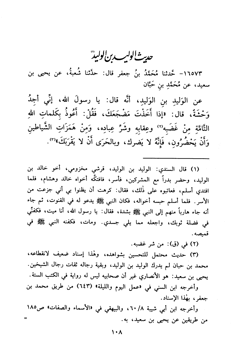 ١٦٥٧٣ - حَدَّثَنَا مُحَمَّدُ بْنُ جَعْفَرٍ، قَالَ: حَدَّثَنَا شُعْبَةُ، عَنْ يَحْيَى بْنِ سَعِيدٍ، عَنْ مُحَمَّدِ بْنِ حَبَّانَ، عَنِ الْوَلِيدِ بْنِ الْوَلِيدِ أَنَّهُ قَالَ: يَا رَسُولَ اللهِ، إِنِّي أَجِدُ وَحْشَةً، قَالَ: " إِذَا أَخَذْتَ مَضْجَعَكَ فَقُلْ: أَعُوذُ بِكَلِمَاتِ اللهِ التَّامَّةِ مِنْ غَضَبِهِ (٢) وَعِقَابِهِ، وَشَرِّ عِبَادِهِ، وَمِنْ هَمَزَاتِ الشَّيَاطِينِ وَأَنْ يَحْضُرُونِ، فَإِنَّهُ لَا يُضَرُّكَ، وَبِالْحَرِيِّ أَنْ لَا يَقْرَبَكَ " (٣)