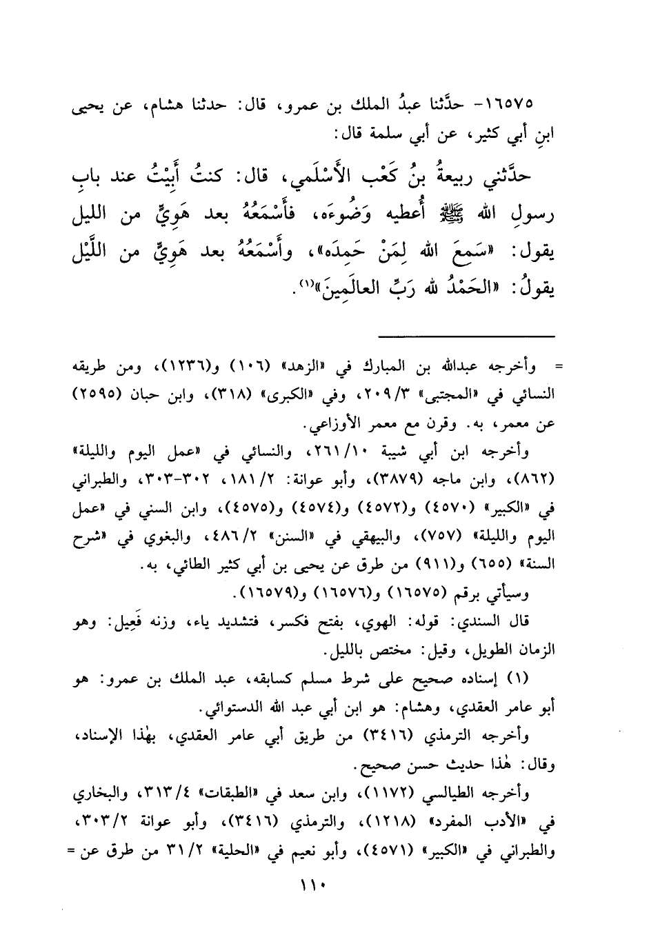 ١٦٥٧٥ - حَدَّثَنَا عَبْدُ الْمَلِكِ بْنُ عَمْرٍو، قَالَ: حَدَّثَنَا هِشَامٌ، عَنْ يَحْيَى بْنِ أَبِي كَثِيرٍ، عَنْ أَبِي سَلَمَةَ قَالَ: حَدَّثَنِي رَبِيعَةُ بْنُ كَعْبٍ الْأَسْلَمِيُّ، قَالَ: كُنْتُ أَبِيتُ عِنْدَ بَابِ رَسُولِ اللهِ صَلَّى اللهُ عَلَيْهِ وَسَلَّمَ أُعْطِيهِ وَضُوءَهُ فَأَسْمَعُهُ بَعْدَ هَوِيٍّ مِنَ اللَّيْلِ يَقُولُ: " سَمِعَ اللهُ لِمَنْ حَمِدَهُ "، وَأَسْمَعُهُ بَعْدَ هَوِيٍّ مِنَ اللَّيْلِ يَقُولُ: " الْحَمْدُ لِلَّهِ رَبِّ الْعَالَمِينَ " (١)