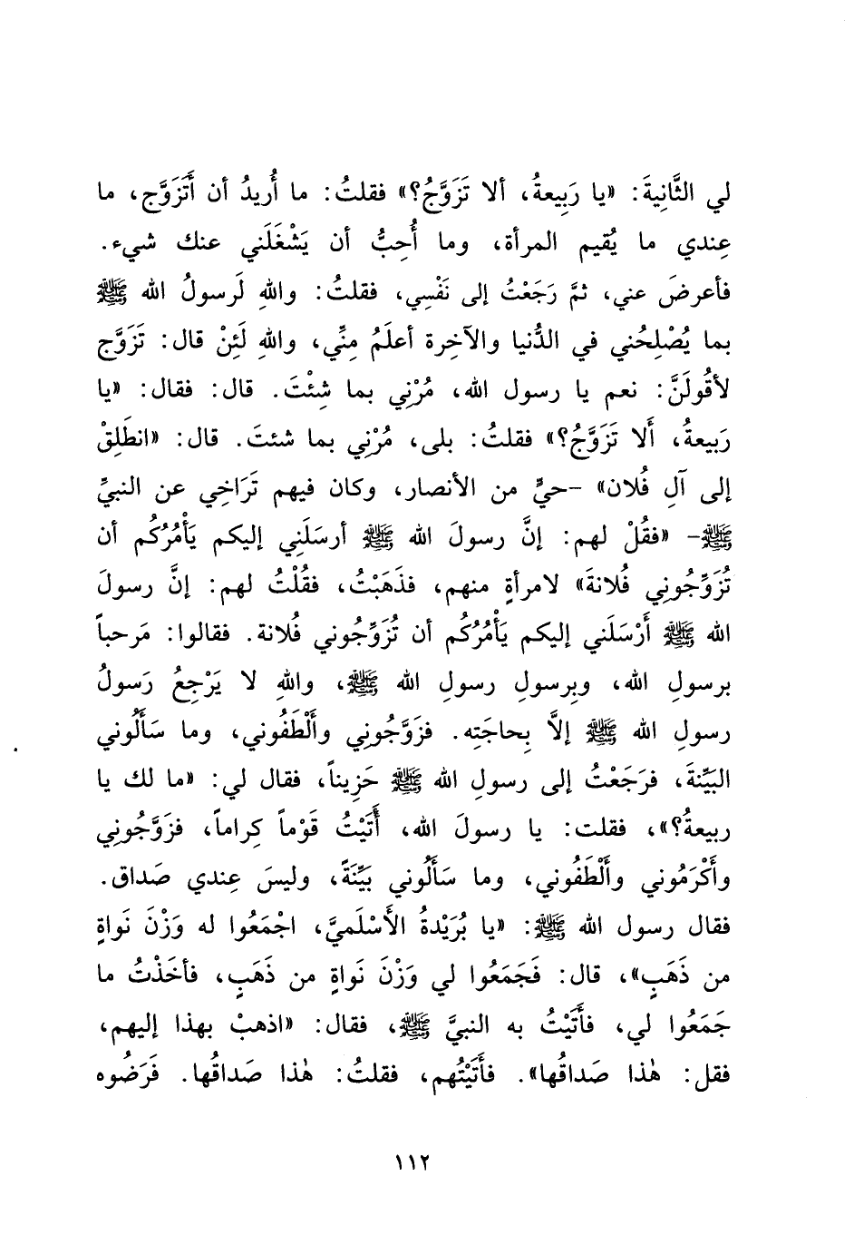 لِي الثَّانِيَةَ: " يَا رَبِيعَةُ، أَلَا تَزَوَّجُ؟ "، فَقُلْتُ: مَا أُرِيدُ أَنْ أَتَزَوَّجَ، مَا عِنْدِي مَا يُقِيمُ الْمَرْأَةَ، وَمَا أُحِبُّ أَنْ يَشْغَلَنِي عَنْكَ شَيْءٌ، فَأَعْرَضَ عَنِّي، ثُمَّ رَجَعْتُ إِلَى نَفْسِي فَقُلْتُ: وَاللهِ لَرَسُولُ اللهِ صَلَّى اللهُ عَلَيْهِ وَسَلَّمَ بِمَا يُصْلِحُنِي فِي الدُّنْيَا وَالْآخِرَةِ أَعْلَمُ مِنِّي، وَاللهِ لَئِنْ قَالَ: تَزَوَّجْ لَأَقُولَنَّ: نَعَمْ يَا رَسُولَ اللهِ، مُرْنِي بِمَا شِئْتَ، قَالَ: فَقَالَ: " يَا رَبِيعَةُ، أَلَا تَزَوَّجُ؟ "، فَقُلْتُ: بَلَى مُرْنِي بِمَا شِئْتَ، قَالَ: " انْطَلِقْ إِلَى آلِ فُلَانٍ حَيٍّ مِنَ الْأَنْصَارِ - وَكَانَ فِيهِمْ تَرَاخٍ - عَنِ النَّبِيِّ صَلَّى اللهُ عَلَيْهِ وَسَلَّمَ فَقُلْ لَهُمْ إِنَّ رَسُولَ اللهِ صَلَّى اللهُ عَلَيْهِ وَسَلَّمَ أَرْسَلَنِي إِلَيْكُمْ يَأْمُرُكُمْ أَنْ تُزَوِّجُونِي فُلَانَةَ لِامْرَأَةٍ مِنْهُمْ "، فَذَهَبْتُ فَقُلْتُ لَهُمْ: إِنَّ رَسُولَ اللهِ صَلَّى اللهُ عَلَيْهِ وَسَلَّمَ أَرْسَلَنِي إِلَيْكُمْ، يَأْمُرُكُمْ أَنْ تُزَوِّجُونِي فُلَانَةَ فَقَالُوا: مَرْحَبًا بِرَسُولِ اللهِ، وَبِرَسُولِ رَسُولِ اللهِ صَلَّى اللهُ عَلَيْهِ وَسَلَّمَ، وَاللهِ لَا يَرْجِعُ رَسُولُ رَسُولِ اللهِ صَلَّى اللهُ عَلَيْهِ وَسَلَّمَ إِلَّا بِحَاجَتِهِ فَزَوَّجُونِي وَأَلْطَفُونِي، وَمَا سَأَلُونِي الْبَيِّنَةَ، فَرَجَعْتُ إِلَى رَسُولِ اللهِ صَلَّى اللهُ عَلَيْهِ وَسَلَّمَ حَزِينًا، فَقَالَ لِي: " مَا لَكَ يَا رَبِيعَةُ؟ "، فَقُلْتُ: يَا رَسُولَ اللهِ، أَتَيْتُ قَوْمًا كِرَامًا فَزَوَّجُونِي، وَأَكْرَمُونِي وَأَلْطَفُونِي وَمَا سَأَلُونِي بَيِّنَةً، وَلَيْسَ عِنْدِي صَدَاقٌ، فَقَالَ رَسُولُ اللهِ صَلَّى اللهُ عَلَيْهِ وَسَلَّمَ: " يَا بُرَيْدَةُ الْأَسْلَمِيُّ، اجْمَعُوا لَهُ وَزْنَ نَوَاةٍ مِنْ ذَهَبٍ "، قَالَ: فَجَمَعُوا لِي وَزْنَ نَوَاةٍ مِنْ ذَهَبٍ، فَأَخَذْتُ مَا جَمَعُوا لِي فَأَتَيْتُ بِهِ النَّبِيَّ صَلَّى اللهُ عَلَيْهِ وَسَلَّمَ، فَقَالَ: " اذْهَبْ بِهَذَا إِلَيْهِمْ فَقُلْ: هَذَا صَدَاقُهَا "، فَأَتَيْتُهُمْ فَقُلْتُ: هَذَا صَدَاقُهَا فَرَضُوهُ
