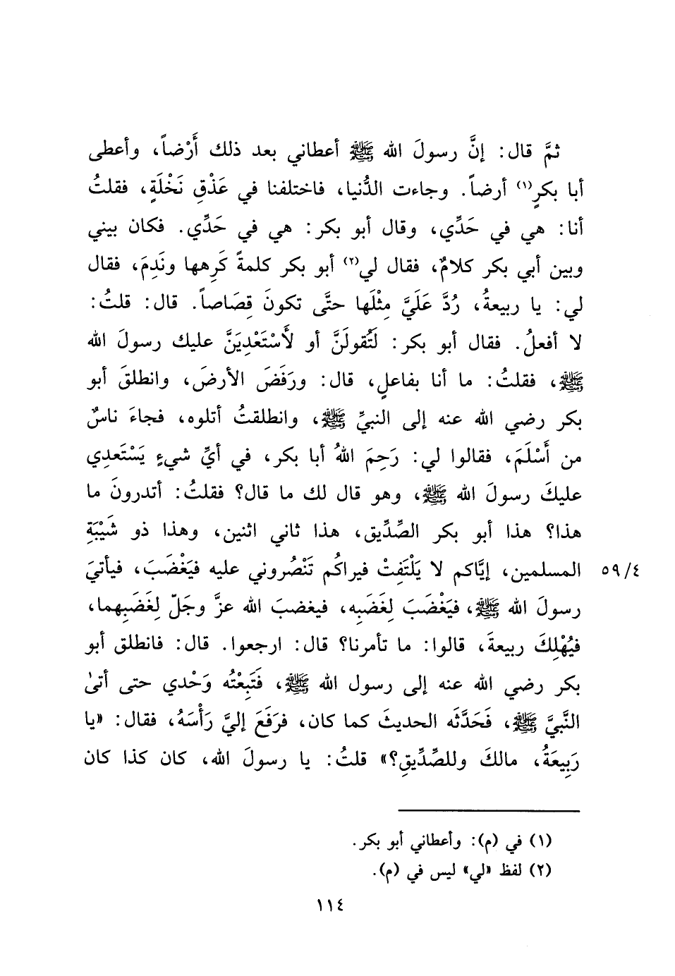 ثُمَّ قَالَ: إِنَّ رَسُولَ اللهِ صَلَّى اللهُ عَلَيْهِ وَسَلَّمَ أَعْطَانِي بَعْدَ ذَلِكَ أَرْضًا، وَأَعْطَى أَبَا بَكْرٍ (١) أَرْضًا، وَجَاءَتِ الدُّنْيَا فَاخْتَلَفْنَا فِي عِذْقِ نَخْلَةٍ فَقُلْتُ: أَنَا هِيَ فِي حَدِّي، وَقَالَ أَبُو بَكْرٍ: هِيَ فِي حَدِّي، فَكَانَ بَيْنِي وَبَيْنَ أَبِي بَكْرٍ كَلَامٌ، فَقَالَ لِي (٢) أَبُو بَكْرٍ كَلِمَةً كَرِهَهَا وَنَدِمَ، فَقَالَ لِي: يَا رَبِيعَةُ رُدَّ عَلَيَّ مِثْلَهَا حَتَّى تَكُونَ قِصَاصًا، قَالَ: قُلْتُ: لَا أَفْعَلُ، فَقَالَ أَبُو بَكْرٍ: لَتَقُولَنَّ أَوْ لَأَسْتَعْدِيَنَّ عَلَيْكَ رَسُولَ اللهِ صَلَّى اللهُ عَلَيْهِ وَسَلَّمَ فَقُلْتُ: مَا أَنَا بِفَاعِلٍ، قَالَ: وَرَفَضَ الْأَرْضَ وَانْطَلَقَ أَبُو بَكْرٍ رَضِيَ اللهُ عَنْهُ إِلَى النَّبِيِّ صَلَّى اللهُ عَلَيْهِ وَسَلَّمَ، وَانْطَلَقْتُ أَتْلُوهُ، فَجَاءَ نَاسٌ مِنْ أَسْلَمَ فَقَالُوا لِي: رَحِمَ اللهُ أَبَا بَكْرٍ، فِي أَيِّ شَيْءٍ يَسْتَعْدِي عَلَيْكَ رَسُولَ اللهِ صَلَّى اللهُ عَلَيْهِ وَسَلَّمَ وَهُوَ قَالَ لَكَ مَا قَالَ، فَقُلْتُ: أَتَدْرُونَ مَا هَذَا؟ هَذَا أَبُو بَكْرٍ الصِّدِّيقُ، هَذَا ثَانِيَ اثْنَيْنِ، وَهَذَا ذُو شَيْبَةِ الْمُسْلِمِينَ، إِيَّاكُمْ لَا يَلْتَفِتُ فَيَرَاكُمْ تَنْصُرُونِي عَلَيْهِ فَيَغْضَبَ فَيَأْتِيَ رَسُولَ اللهِ صَلَّى اللهُ عَلَيْهِ وَسَلَّمَ فَيَغْضَبَ لِغَضَبِهِ، فَيَغْضَبَ اللهُ عَزَّ وَجَلَّ لِغَضَبِهِمَا فَيُهْلِكَ رَبِيعَةَ، قَالُوا: مَا تَأْمُرُنَا؟ قَالَ: ارْجِعُوا، قَالَ: فَانْطَلَقَ أَبُو بَكْرٍ رَضِيَ اللهُ عَنْهُ إِلَى رَسُولِ اللهِ صَلَّى اللهُ عَلَيْهِ وَسَلَّمَ فَتَبِعْتُهُ وَحْدِي، حَتَّى أَتَى النَّبِيَّ صَلَّى اللهُ عَلَيْهِ وَسَلَّمَ فَحَدَّثَهُ الْحَدِيثَ كَمَا كَانَ، فَرَفَعَ إِلَيَّ رَأْسَهُ فَقَالَ: " يَا رَبِيعَةُ، مَا لَكَ وَلِلصِّدِّيقِ؟ "، قُلْتُ: يَا رَسُولَ اللهِ، كَانَ كَذَا كَانَ