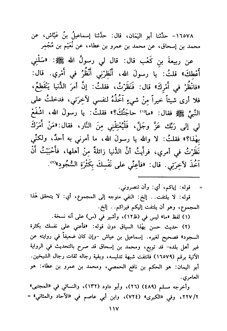 ١٦٥٧٨ - حَدَّثَنَا أَبُو الْيَمَانِ، قَالَ: حَدَّثَنَا إِسْمَاعِيلُ بْنُ عَيَّاشٍ، عَنْ مُحَمَّدِ بْنِ إِسْحَاقَ، عَنْ مُحَمَّدِ بْنِ عَمْرِو بْنِ عَطَاءٍ، عَنْ نُعَيْمِ بْنِ مُجْمِرٍ، عَنْ رَبِيعَةَ بْنِ كَعْبٍ قَالَ: قَالَ لِي رَسُولُ اللهِ صَلَّى اللهُ عَلَيْهِ وَسَلَّمَ: " سَلْنِي أُعْطِكَ "، قُلْتُ: يَا رَسُولَ اللهِ، أَنْظِرْنِي أَنْظُرْ فِي أَمْرِي، قَالَ: " فَانْظُرْ فِي أَمْرِكَ "، قَالَ: فَنَظَرْتُ فَقُلْتُ: إِنَّ أَمْرَ الدُّنْيَا يَنْقَطِعُ فَلَا أَرَى شَيْئًا خَيْرًا مِنْ شَيْءٍ آخُذُهُ لِنَفْسِي لِآخِرَتِي، فَدَخَلْتُ عَلَى النَّبِيِّ صَلَّى اللهُ عَلَيْهِ وَسَلَّمَ فَقَالَ: " مَا (١) حَاجَتُكَ؟ "، فَقُلْتُ: يَا رَسُولَ اللهِ، اشْفَعْ لِي إِلَى رَبِّكَ عَزَّ وَجَلَّ، فَلْيُعْتِقْنِي مِنَ النَّارِ، فَقَالَ: " مَنْ أَمَرَكَ بِهَذَا؟ "، فَقُلْتُ: لَا وَاللهِ يَا رَسُولَ اللهِ، مَا أَمَرَنِي بِهِ أَحَدٌ، وَلَكِنِّي نَظَرْتُ فِي أَمْرِي فَرَأَيْتُ أَنَّ الدُّنْيَا زَائِلَةٌ مِنْ أَهْلِهَا، فَأَحْبَبْتُ أَنْ آخُذَ لِآخِرَتِي، قَالَ: " فَأَعِنِّي عَلَى نَفْسِكَ بِكَثْرَةِ السُّجُودِ " (٢)
