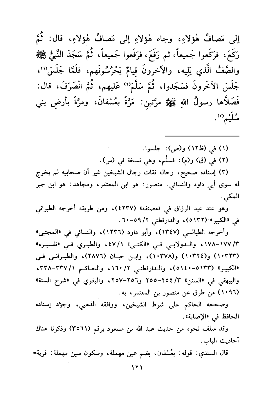 إِلَى مَصَافِّ هَؤُلَاءِ، وَجَاءَ هَؤُلَاءِ إِلَى مَصَافِّ هَؤُلَاءِ، قَالَ: ثُمَّ رَكَعَ فَرَكَعُوا جَمِيعًا، ثُمَّ رَفَعَ فَرَفَعُوا جَمِيعًا، ثُمَّ سَجَدَ النَّبِيُّ صَلَّى اللهُ عَلَيْهِ وَسَلَّمَ وَالصَّفُّ الَّذِي يَلِيهِ، وَالْآخَرُونَ قِيَامٌ يَحْرُسُونَهُمْ، فَلَمَّا جَلَسَ (١) جَلَسَ الْآخَرُونَ، فَسَجَدُوا ثُمَّ سَلَّمَ (٢) عَلَيْهِمْ ثُمَّ انْصَرَفَ، قَالَ: فَصَلَّاهَا رَسُولُ اللهِ صَلَّى اللهُ عَلَيْهِ وَسَلَّمَ مَرَّتَيْنِ: مَرَّةً بِعُسْفَانَ، وَمَرَّةً بِأَرْضِ بَنِي سُلَيْمٍ " (٣)