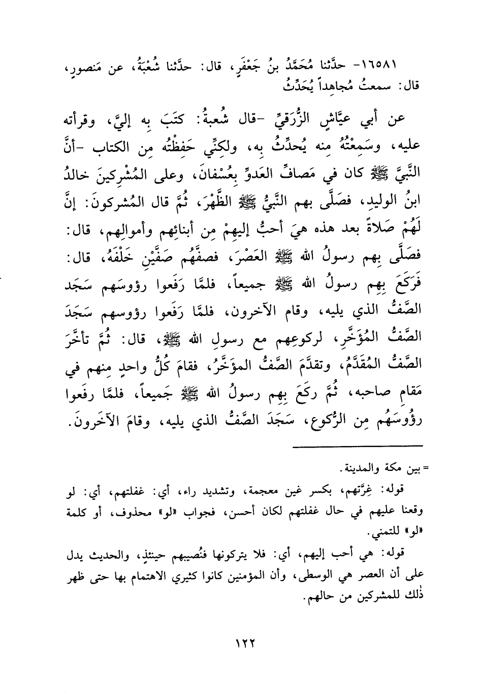 ١٦٥٨١ - حَدَّثَنَا مُحَمَّدُ بْنُ جَعْفَرٍ، قَالَ: حَدَّثَنَا شُعْبَةُ، عَنْ مَنْصُورٍ قَالَ: سَمِعْتُ مُجَاهِدًا يُحَدِّثُ، عَنْ أَبِي عَيَّاشٍ الزُّرَقِيِّ - قَالَ شُعْبَةُ: كَتَبَ بِهِ إِلَيَّ، وَقَرَأْتُهُ عَلَيْهِ، وَسَمِعْتُهُ مِنْهُ يُحَدِّثُ بِهِ، وَلَكِنِّي حَفِظْتُهُ مِنَ الْكِتَابِ - أَنَّ النَّبِيَّ صَلَّى اللهُ عَلَيْهِ وَسَلَّمَ كَانَ فِي مَصَافِّ الْعَدُوِّ بِعُسْفَانَ وَعَلَى الْمُشْرِكِينَ خَالِدُ بْنُ الْوَلِيدِ، فَصَلَّى بِهِمُ النَّبِيُّ صَلَّى اللهُ عَلَيْهِ وَسَلَّمَ الظُّهْرَ، ثُمَّ قَالَ الْمُشْرِكُونَ: إِنَّ لَهُمْ صَلَاةً بَعْدَ هَذِهِ هِيَ أَحَبُّ إِلَيْهِمْ مِنْ أَبْنَائِهِمْ وَأَمْوَالِهِمْ قَالَ: " فَصَلَّى بِهِمْ رَسُولُ اللهِ صَلَّى اللهُ عَلَيْهِ وَسَلَّمَ الْعَصْرَ، فَصَفَّهُمْ صَفَّيْنِ خَلْفَهُ، قَالَ: فَرَكَعَ بِهِمْ رَسُولُ اللهِ صَلَّى اللهُ عَلَيْهِ وَسَلَّمَ جَمِيعًا، فَلَمَّا رَفَعُوا رُءُوسَهُمْ سَجَدَ الصَّفُّ الَّذِي يَلِيهِ وَقَامَ الْآخَرُونَ، فَلَمَّا رَفَعُوا رُءُوسَهُمْ سَجَدَ الصَّفُّ الْمُؤَخَّرُ لِرُكُوعِهِمْ مَعَ رَسُولِ اللهِ صَلَّى اللهُ عَلَيْهِ وَسَلَّمَ، قَالَ: ثُمَّ تَأَخَّرَ الصَّفُّ الْمُقَدَّمُ وَتَقَدَّمَ الصَّفُّ الْمُؤَخَّرُ، فَقَامَ كُلُّ وَاحِدٍ مِنْهُمْ فِي مَقَامِ صَاحِبِهِ، ثُمَّ رَكَعَ بِهِمْ رَسُولُ اللهِ صَلَّى اللهُ عَلَيْهِ وَسَلَّمَ جَمِيعًا، فَلَمَّا رَفَعُوا رُءُوسَهُمْ مِنَ الرُّكُوعِ سَجَدَ الصَّفُّ الَّذِي يَلِيهِ، وَقَامَ الْآخَرُونَ