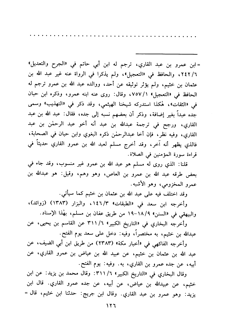 وقال البخاري في "التاريخ الكبير" ٦/٣١١: وقال محمد بن يزيد: عن ابن خثيم، عن عبيد الله بن عياض، عن أبيه، عن جده عمرو القاري. قال ابن يزيد: وهو عمرو بن عبد القاري. وقال ابن جريج: حدثنا ابن خثيم، قال=