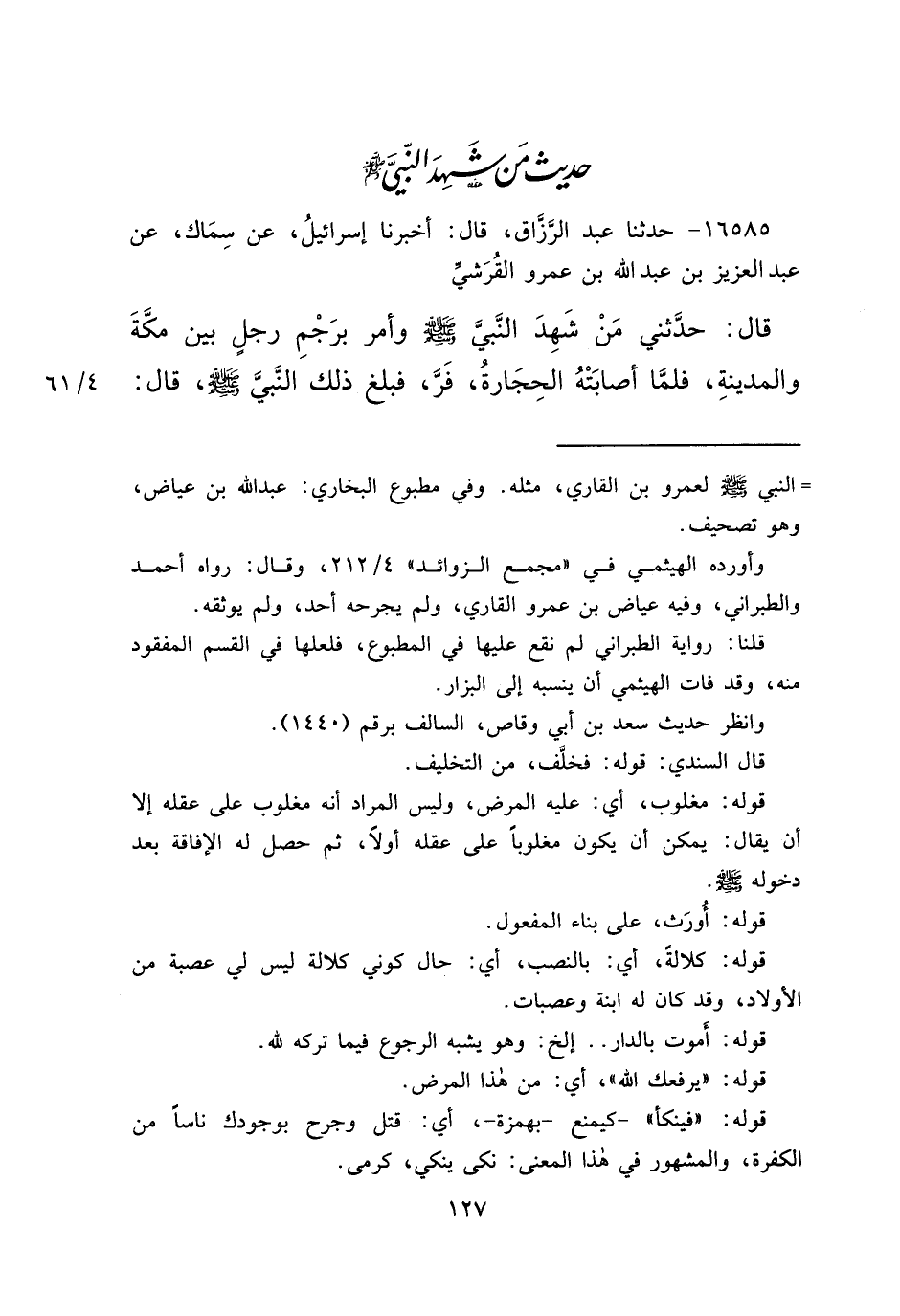 ١٦٥٨٥ - حَدَّثَنَا عَبْدُ الرَّزَّاقِ، قَالَ: أَخْبَرَنَا إِسْرَائِيلُ، عَنْ سِمَاكٍ، عَنْ عَبْدِ الْعَزِيزِ بْنِ عَبْدِ اللهِ بْنِ عَمْرٍو الْقُرَشِيِّ قَالَ: حَدَّثَنِي مَنْ شَهِدَ النَّبِيَّ صَلَّى اللهُ عَلَيْهِ وَسَلَّمَ وَأَمَرَ بِرَجْمِ رَجُلٍ بَيْنَ مَكَّةَ وَالْمَدِينَةِ، فَلَمَّا أَصَابَتْهُ الْحِجَارَةُ فَرَّ، فَبَلَغَ ذَلِكَ النَّبِيَّ صَلَّى اللهُ عَلَيْهِ وَسَلَّمَ قَالَ: "