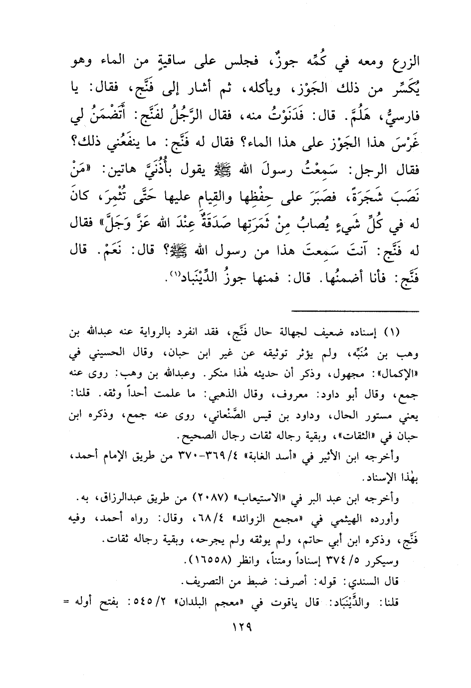 الزَّرْعِ، وَمَعَهُ فِي كُمِّهِ جَوْزٌ، فَجَلَسَ عَلَى سَاقِيَةٍ مِنَ الْمَاءِ وَهُوَ يَكْسِرُ مِنْ ذَلِكَ الْجَوْزِ وَيَأْكُلُهُ، ثُمَّ أَشَارَ إِلَى فَنَّجَ فَقَالَ: يَا فَارِسِيُّ هَلُمَّ، قَالَ: فَدَنَوْتُ مِنْهُ فَقَالَ الرَّجُلُ لِفَنَّجَ: أَتَضْمَنُ لِي غَرْسَ هَذَا الْجَوْزِ عَلَى هَذَا الْمَاءِ؟ فَقَالَ لَهُ فَنَّجُ: مَا يَنْفَعُنِي ذَلِكَ؟ فَقَالَ الرَّجُلُ: سَمِعْتُ رَسُولَ اللهِ صَلَّى اللهُ عَلَيْهِ وَسَلَّمَ يَقُولُ بِأُذُنَيَّ هَاتَيْنِ: " مَنْ نَصَبَ شَجَرَةً فَصَبَرَ عَلَى حِفْظِهَا وَالْقِيَامِ عَلَيْهَا حَتَّى تُثْمِرَ كَانَ لَهُ فِي كُلِّ شَيْءٍ يُصَابُ مِنْ ثَمَرَتِهَا صَدَقَةٌ عِنْدَ اللهِ عَزَّ وَجَلَّ "، فَقَالَ لَهُ فَنَّجُ: آنْتَ سَمِعْتَ هَذَا مِنْ رَسُولِ اللهِ صَلَّى اللهُ عَلَيْهِ وَسَلَّمَ؟ قَالَ: نَعَمْ، قَالَ فَنَّجُ: فَأَنَا أَضْمَنُهَا، قَالَ: فَمِنْهَا جَوْزُ الدَّيْنَبَاذِ (١)