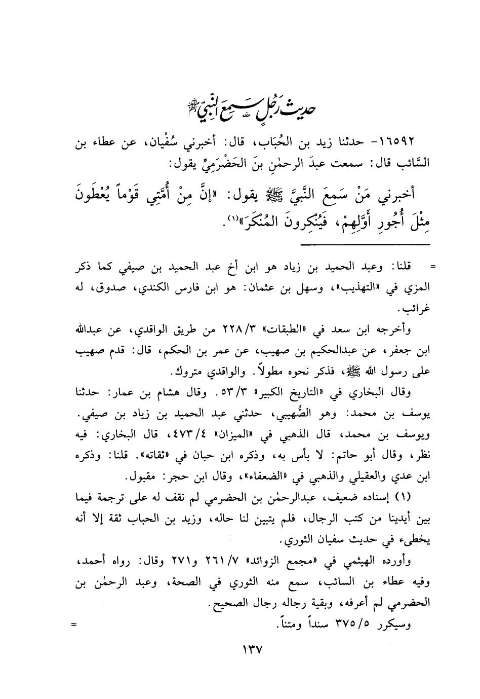 ١٦٥٩٢ - حَدَّثَنَا زَيْدُ بْنُ الْحُبَابِ، قَالَ: أَخْبَرَنِي سُفْيَانُ، عَنْ عَطَاءِ بْنِ السَّائِبِ قَالَ: سَمِعْتُ عَبْدَ الرَّحْمَنِ بْنَ الْحَضْرَمِيِّ يَقُولُ: أَخْبَرَنِي مَنْ سَمِعَ النَّبِيَّ صَلَّى اللهُ عَلَيْهِ وَسَلَّمَ يَقُولُ: " إِنَّ مِنْ أُمَّتِي قَوْمًا يُعْطَوْنَ مِثْلَ أُجُورِ أَوَّلِهِمْ فَيُنْكِرُونَ الْمُنْكَرَ " (١)