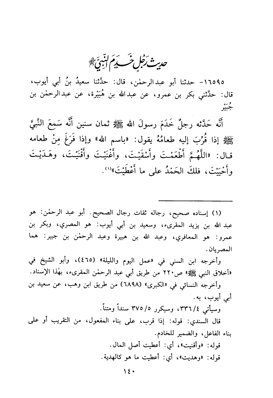 ١٦٥٩٥ - حَدَّثَنَا أَبُو عَبْدِ الرَّحْمَنِ، قَالَ: حَدَّثَنَا سَعِيدُ بْنُ أَبِي أَيُّوبَ، قَالَ: حَدَّثَنِي بَكْرُ بْنُ عَمْرٍو، عَنْ عَبْدِ اللهِ بْنِ هُبَيْرَةَ، عَنْ عَبْدِ الرَّحْمَنِ بْنِ جُبَيْرٍ، أَنَّهُ حَدَّثَهُ رَجُلٌ خَدَمَ رَسُولَ اللهِ صَلَّى اللهُ عَلَيْهِ وَسَلَّمَ ثَمَانِ سِنِينَ، أَنَّهُ سَمِعَ النَّبِيَّ صَلَّى اللهُ عَلَيْهِ وَسَلَّمَ إِذَا قُرِّبَ إِلَيْهِ طَعَامُهُ يَقُولُ: " بِسْمِ اللهِ "، وَإِذَا فَرَغَ مِنْ طَعَامِهِ قَالَ: " اللهُمَّ أَطْعَمْتَ وَأَسْقَيْتَ، وَأَغْنَيْتَ وَأَقْنَيْتَ، وَهَدَيْتَ وَأَحْيَيْتَ، فَلَكَ الْحَمْدُ عَلَى مَا أَعْطَيْتَ " (١)