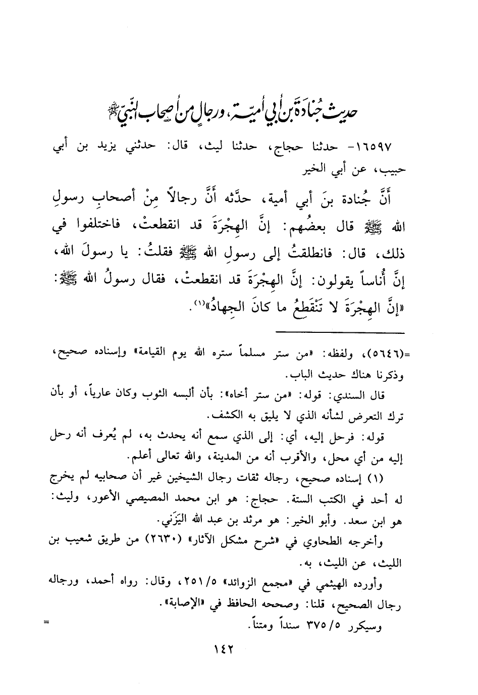 ١٦٥٩٧ - حَدَّثَنَا حَجَّاجٌ، حَدَّثَنَا لَيْثٌ، قَالَ: حَدَّثَنِي يَزِيدُ بْنُ أَبِي حَبِيبٍ، عَنْ أَبِي الْخَيْرِ، أَنَّ جُنَادَةَ بْنَ أَبِي أُمَيَّةَ حَدَّثَهُ، أَنَّ رِجَالًا مِنْ أَصْحَابِ رَسُولِ اللهِ صَلَّى اللهُ عَلَيْهِ وَسَلَّمَ قَالَ بَعْضُهُمْ: إِنَّ الْهِجْرَةَ قَدِ انْقَطَعَتْ، فَاخْتَلَفُوا فِي ذَلِكَ، قَالَ: فَانْطَلَقْتُ إِلَى رَسُولِ اللهِ صَلَّى اللهُ عَلَيْهِ وَسَلَّمَ فَقُلْتُ: يَا رَسُولَ اللهِ، إِنَّ أُنَاسًا يَقُولُونَ: إِنَّ الْهِجْرَةَ قَدِ انْقَطَعَتْ، فَقَالَ رَسُولُ اللهِ صَلَّى اللهُ عَلَيْهِ وَسَلَّمَ: " إِنَّ الْهِجْرَةَ لَا تَنْقَطِعُ مَا كَانَ الْجِهَادُ " (١)