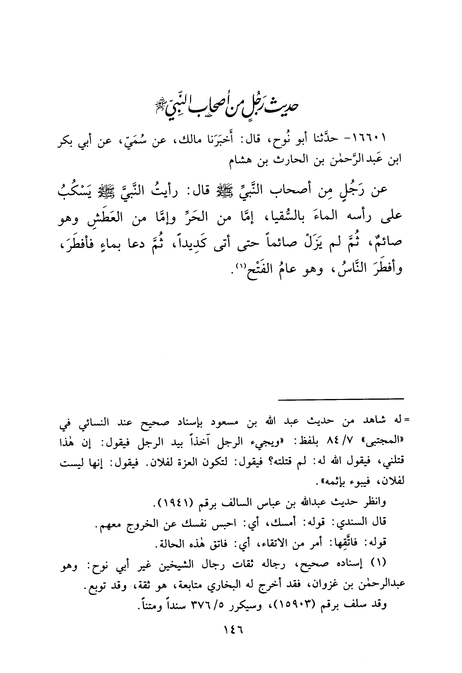 ١٦٦٠١ - حَدَّثَنَا أَبُو نُوحٍ، قَالَ: أَخْبَرَنَا مَالِكٌ، عَنْ سُمَيٍّ، عَنْ أَبِي بَكْرِ بْنِ عَبْدِ الرَّحْمَنِ بْنِ الْحَارِثِ بْنِ هِشَامٍ، عَنْ رَجُلٍ مِنْ أَصْحَابِ النَّبِيِّ صَلَّى اللهُ عَلَيْهِ وَسَلَّمَ قَالَ: " رَأَيْتُ النَّبِيَّ صَلَّى اللهُ عَلَيْهِ وَسَلَّمَ يَسْكُبُ عَلَى رَأْسِهِ الْمَاءَ بِالسُّقْيَا، إِمَّا مِنَ الْحَرِّ وَإِمَّا مِنَ الْعَطَشِ وَهُوَ صَائِمٌ، ثُمَّ لَمْ يَزَلْ صَائِمًا حَتَّى أَتَى كَدِيدًا، ثُمَّ دَعَا بِمَاءٍ فَأَفْطَرَ، وَأَفْطَرَ النَّاسُ، وَهُوَ عَامُ الْفَتْحِ " (١)