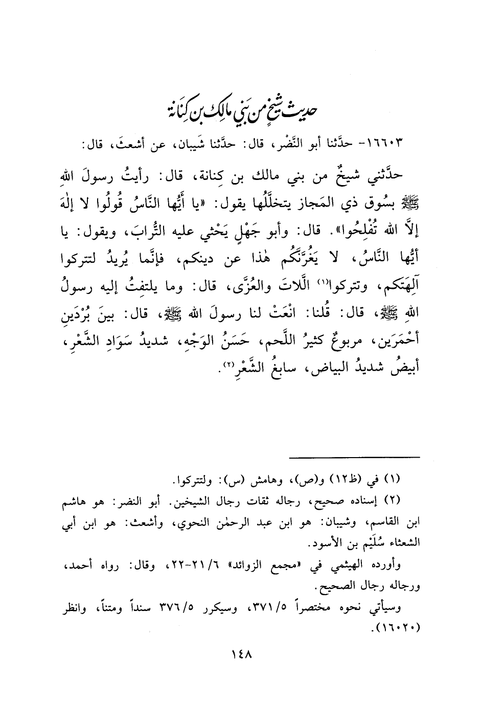 ١٦٦٠٣ - حَدَّثَنَا أَبُو النَّضْرِ، قَالَ: حَدَّثَنَا شَيْبَانُ، عَنْ أَشْعَثَ قَالَ: حَدَّثَنِي شَيْخٌ مِنْ بَنِي مَالِكِ بْنِ كِنَانَةَ، قَالَ: رَأَيْتُ رَسُولَ اللهِ صَلَّى اللهُ عَلَيْهِ وَسَلَّمَ بِسُوقِ ذِي الْمَجَازِ يَتَخَلَّلُهَا يَقُولُ: " يَا أَيُّهَا النَّاسُ، قُولُوا لَا إِلَهَ إِلَّا اللهُ تُفْلِحُوا "، قَالَ: وَأَبُو جَهْلٍ يَحْثِي عَلَيْهِ التُّرَابَ وَيَقُولُ: يَا أَيُّهَا النَّاسُ، لَا يَغُرَّنَّكُمْ هَذَا عَنْ دِينِكُمْ، فَإِنَّمَا يُرِيدُ لِتَتْرُكُوا آلِهَتَكُمْ، وَتَتْرُكُوا (١) اللَّاتَ وَالْعُزَّى، قَالَ: وَمَا يَلْتَفِتُ إِلَيْهِ رَسُولُ اللهِ صَلَّى اللهُ عَلَيْهِ وَسَلَّمَ، قَالَ: قُلْنَا: انْعَتْ لَنَا رَسُولَ اللهِ صَلَّى اللهُ عَلَيْهِ وَسَلَّمَ، قَالَ: " بَيْنَ بُرْدَيْنِ أَحْمَرَيْنِ، مَرْبُوعٌ كَثِيرُ اللَّحْمِ، حَسَنُ الْوَجْهِ، شَدِيدُ سَوَادِ الشَّعْرِ، أَبْيَضُ شَدِيدُ الْبَيَاضِ، سَابِغُ الشَّعْرِ " (٢)