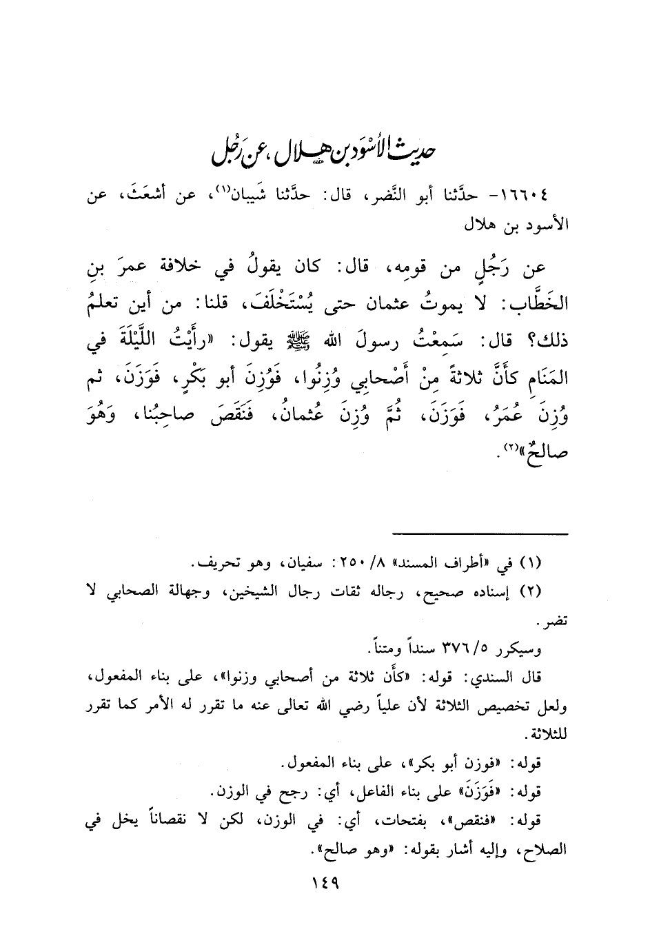 ١٦٦٠٤ - حَدَّثَنَا أَبُو النَّضْرِ، قَالَ: حَدَّثَنَا شَيْبَانُ (١) ، عَنْ أَشْعَثَ، عَنِ الْأَسْوَدِ بْنِ هِلَالٍ، عَنْ رَجُلٍ، مِنْ قَوْمِهِ قَالَ: كَانَ يَقُولُ فِي خِلَافَةِ عُمَرَ بْنِ الْخَطَّابِ: لَا يَمُوتُ عُثْمَانُ حَتَّى يُسْتَخْلَفَ، قُلْنَا: مِنْ أَيْنَ تَعْلَمُ ذَلِكَ؟ قَالَ: سَمِعْتُ رَسُولَ اللهِ صَلَّى اللهُ عَلَيْهِ وَسَلَّمَ يَقُولُ: " رَأَيْتُ اللَّيْلَةَ فِي الْمَنَامِ كَأَنَّهُ ثَلَاثَةٌ مِنْ أَصْحَابِي وُزِنُوا، فَوُزِنَ أَبُو بَكْرٍ فَوَزَنَ، ثُمَّ وُزِنَ عُمَرُ فَوَزَنَ، ثُمَّ وُزِنَ عُثْمَانُ فَنَقَصَ صَاحِبُنَا، وَهُوَ صَالِحٌ " (٢)