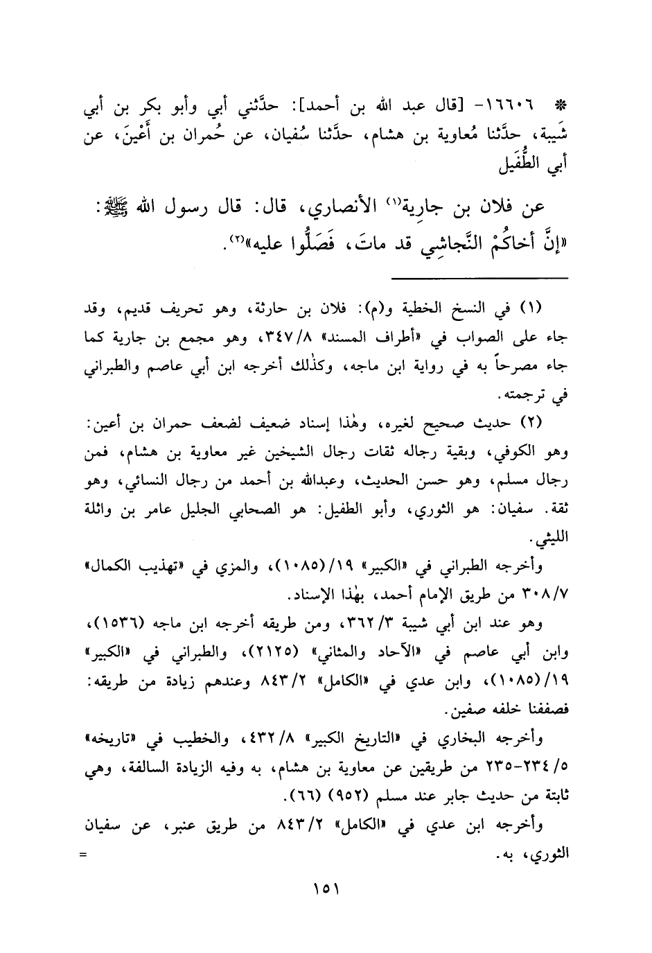 * ١٦٦٠٦ - قَالَ عَبْدُ اللهِ بْنُ أَحْمَدَ، حَدَّثَنِي أَبِي، وَأَبُو بَكْرِ بْنُ أَبِي شَيْبَةَ، حَدَّثَنَا مُعَاوِيَةُ بْنُ هِشَامٍ، حَدَّثَنَا سُفْيَانُ، عَنْ حُمْرَانَ بْنِ أَعْيَنَ، عَنْ أَبِي الطُّفَيْلِ، عَنْ فُلَانِ بْنِ جَارِيَةَ (١) الْأَنْصَارِيِّ قَالَ: قَالَ رَسُولُ اللهِ صَلَّى اللهُ عَلَيْهِ وَسَلَّمَ: " إِنَّ أَخَاكُمُ النَّجَاشِيَّ قَدْ مَاتَ فَصَلُّوا عَلَيْهِ " (٢)