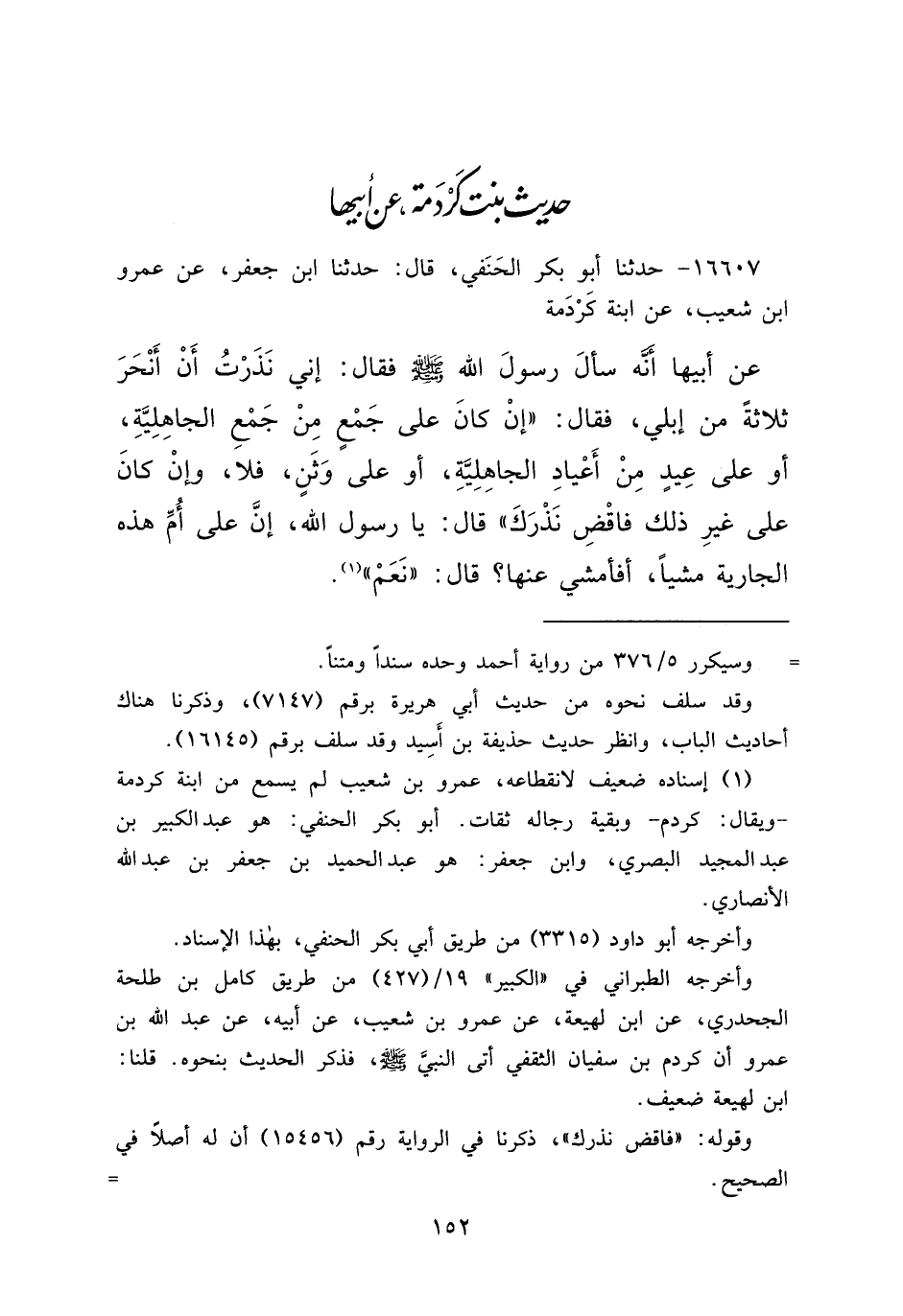١٦٦٠٧ - حَدَّثَنَا أَبُو بَكْرٍ الْحَنَفِيُّ، قَالَ: حَدَّثَنَا ابْنُ جَعْفَرٍ، عَنْ عَمْرِو بْنِ شُعَيْبٍ، عَنِ ابْنَةِ كَرْدَمَةَ، عَنْ أَبِيهَا، أَنَّهُ سَأَلَ رَسُولَ اللهِ صَلَّى اللهُ عَلَيْهِ وَسَلَّمَ فَقَالَ: إِنِّي نَذَرْتُ أَنْ أَنْحَرَ ثَلَاثَةً مِنْ إِبِلِي فَقَالَ: " إِنْ كَانَ عَلَى جَمْعٍ مِنْ جَمْعِ الْجَاهِلِيَّةِ، أَوْ عَلَى عِيدٍ مِنْ أَعْيَادِ الْجَاهِلِيَّةِ، أَوْ عَلَى وَثَنٍ فَلَا، وَإِنْ كَانَ عَلَى غَيْرِ ذَلِكَ فَاقْضِ نَذْرَكَ "، قَالَ: يَا رَسُولَ اللهِ، إِنَّ عَلَى أُمِّ هَذِهِ الْجَارِيَةِ مَشْيًا أَفَأَمْشِي عَنْهَا؟ قَالَ: " نَعَمْ " (١)
