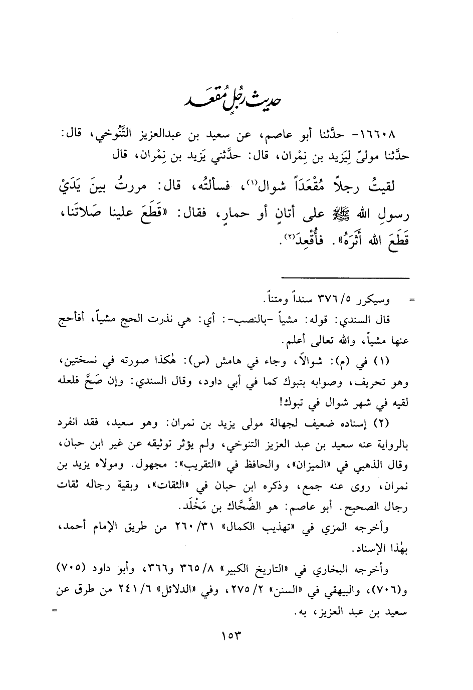 ١٦٦٠٨ - حَدَّثَنَا أَبُو عَاصِمٍ، عَنْ سَعِيدِ بْنِ عَبْدِ الْعَزِيزِ التَّنُوخِيِّ قَالَ: حَدَّثَنَا مَوْلًى لِيَزِيدَ بْنِ نِمْرَانَ، قَالَ: حَدَّثَنِي يَزِيدُ بْنُ نِمْرَانَ، قَالَ: لَقِيتُ رَجُلًا مُقْعَدًا شَوَّال (١) فَسَأَلْتُهُ قَالَ: مَرَرْتُ بَيْنَ يَدَيْ رَسُولِ اللهِ صَلَّى اللهُ عَلَيْهِ وَسَلَّمَ عَلَى أَتَانٍ أَوْ حِمَارٍ فَقَالَ: " قَطَعَ عَلَيْنَا صَلَاتَنَا قَطَعَ اللهُ أَثَرَهُ "، فَأُقْعِدَ (٢)