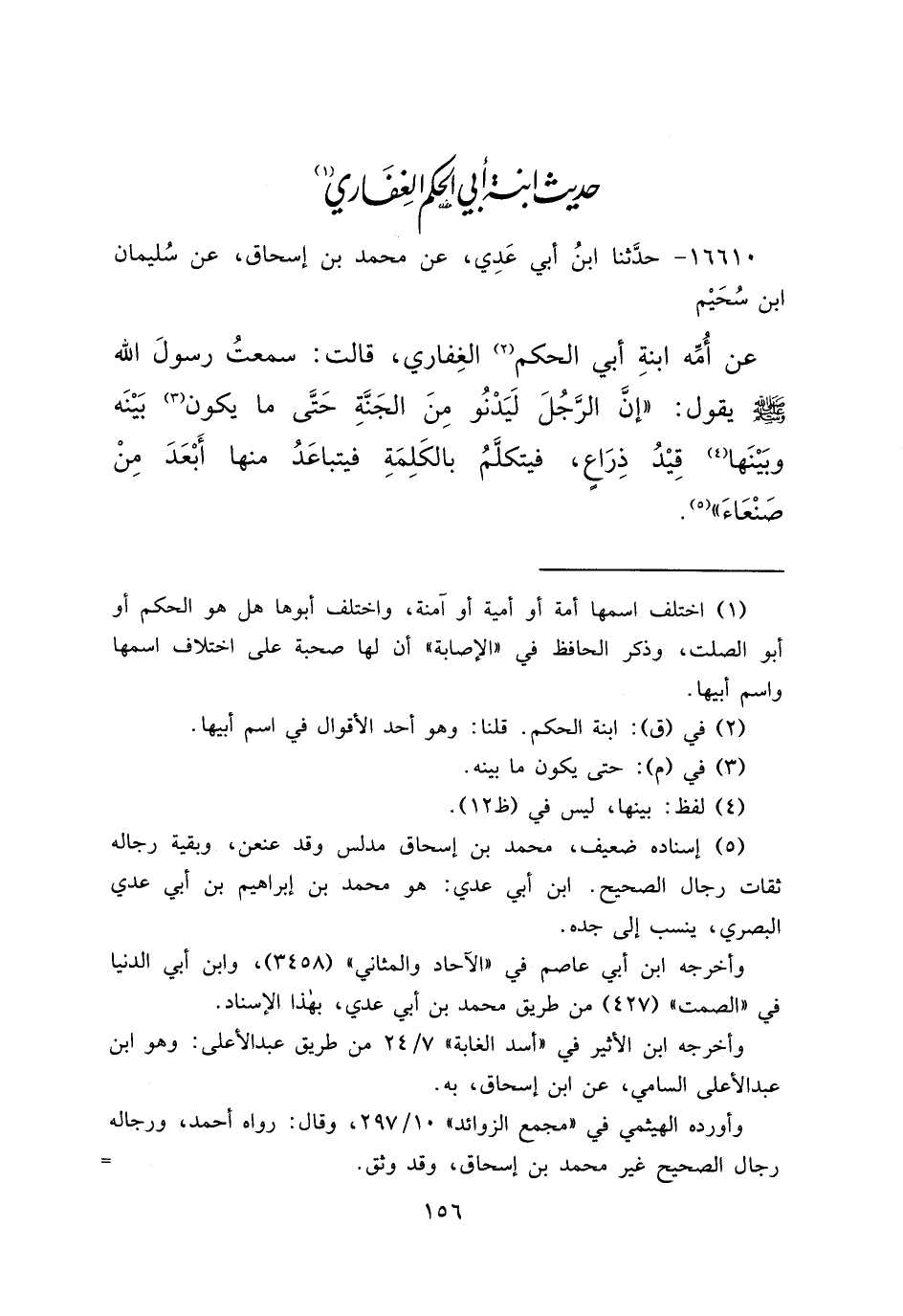 ١٦٦١٠ - حَدَّثَنَا ابْنُ أَبِي عَدِيٍّ، عَنْ مُحَمَّدِ بْنِ إِسْحَاقَ، عَنْ سُلَيْمَانَ بْنِ سُحَيْمٍ، عَنْ أُمِّهِ ابْنَةِ أَبِي الْحَكَمِ (٢) الْغِفَارِيِّ قَالَتْ: سَمِعْتُ رَسُولَ اللهِ صَلَّى اللهُ عَلَيْهِ وَسَلَّمَ يَقُولُ: " إِنَّ الرَّجُلَ لَيَدْنُو مِنَ الْجَنَّةِ حَتَّى مَا يَكُونَ (٣) بَيْنَهُ وَبَيْنَهَا (٤) قِيدُ ذِرَاعٍ فَيَتَكَلَّمُ بِالْكَلِمَةِ فَيَتَبَاعَدُ مِنْهَا أَبْعَدَ مِنْ صَنْعَاءَ " (٥)