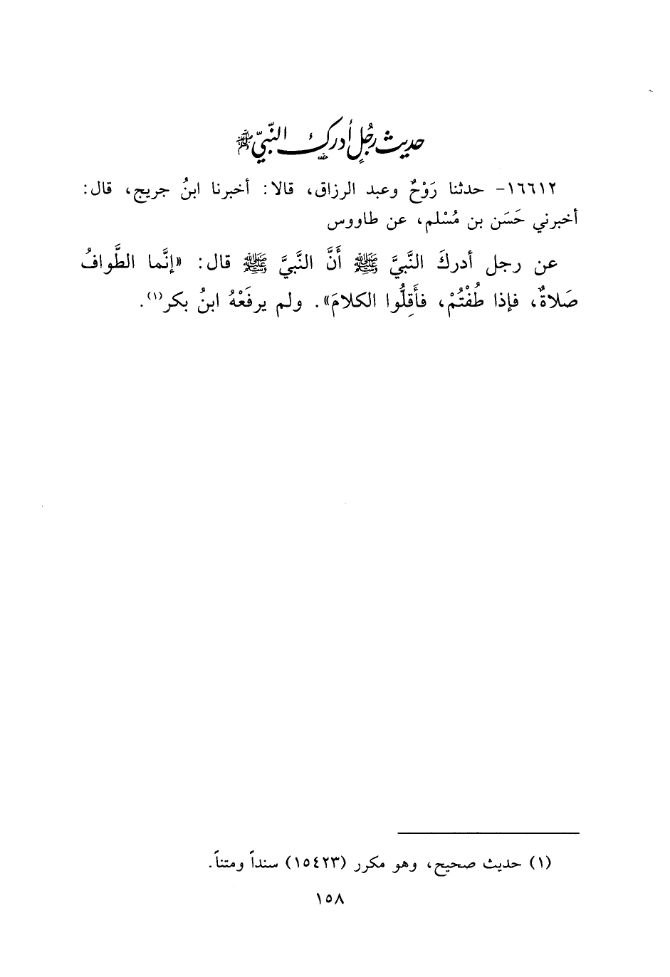 ١٦٦١٢ - حَدَّثَنَا رَوْحٌ، وَعَبْدُ الرَّزَّاقِ، قَالَا: أَخْبَرَنَا ابْنُ جُرَيْجٍ قَالَ: أَخْبَرَنِي حَسَنُ بْنُ مُسْلِمٍ، عَنْ طَاوُسٍ، عَنْ رَجُلٍ أَدْرَكَ النَّبِيَّ صَلَّى اللهُ عَلَيْهِ وَسَلَّمَ، أَنَّ النَّبِيَّ صَلَّى اللهُ عَلَيْهِ وَسَلَّمَ قَالَ: " إِنَّمَا الطَّوَافُ صَلَاةٌ، فَإِذَا طُفْتُمْ فَأَقِلُّوا الْكَلَامَ "، وَلَمْ يَرْفَعْهُ ابْنُ بَكْرٍ (١)