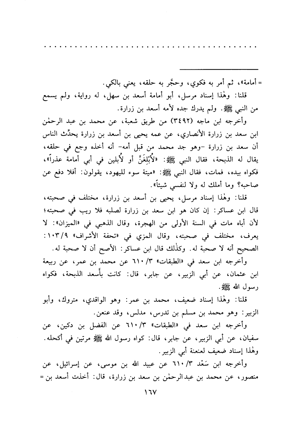وأخرجه ابن ماجه (٣٤٩٢) من طريق شعبة، عن محمد بن عبد الرحمن ابن سعد بن زرارة الأنصاري، عن عمه يحيى بن أسعد بن زرارة يحدِّث الناس أن سعد بن زرارة- وهو جد محمد من قبل أمه- أنه أخذه وجع في حلقه، يقال له الذبحة، فقال النبي صَلَّى اللهُ عَلَيْهِ وَسَلَّمَ: "لأُبْلغَنَّ أو لأُبلين في أبي أمامة عذراً"، فكواه بيده، فمات، فقال النبي صَلَّى اللهُ عَلَيْهِ وَسَلَّمَ: "ميتة سوء لليهود، يقولون: أفلا دفع عن صاحبه؟ وما أملك له ولا لنفسي شيئاً".