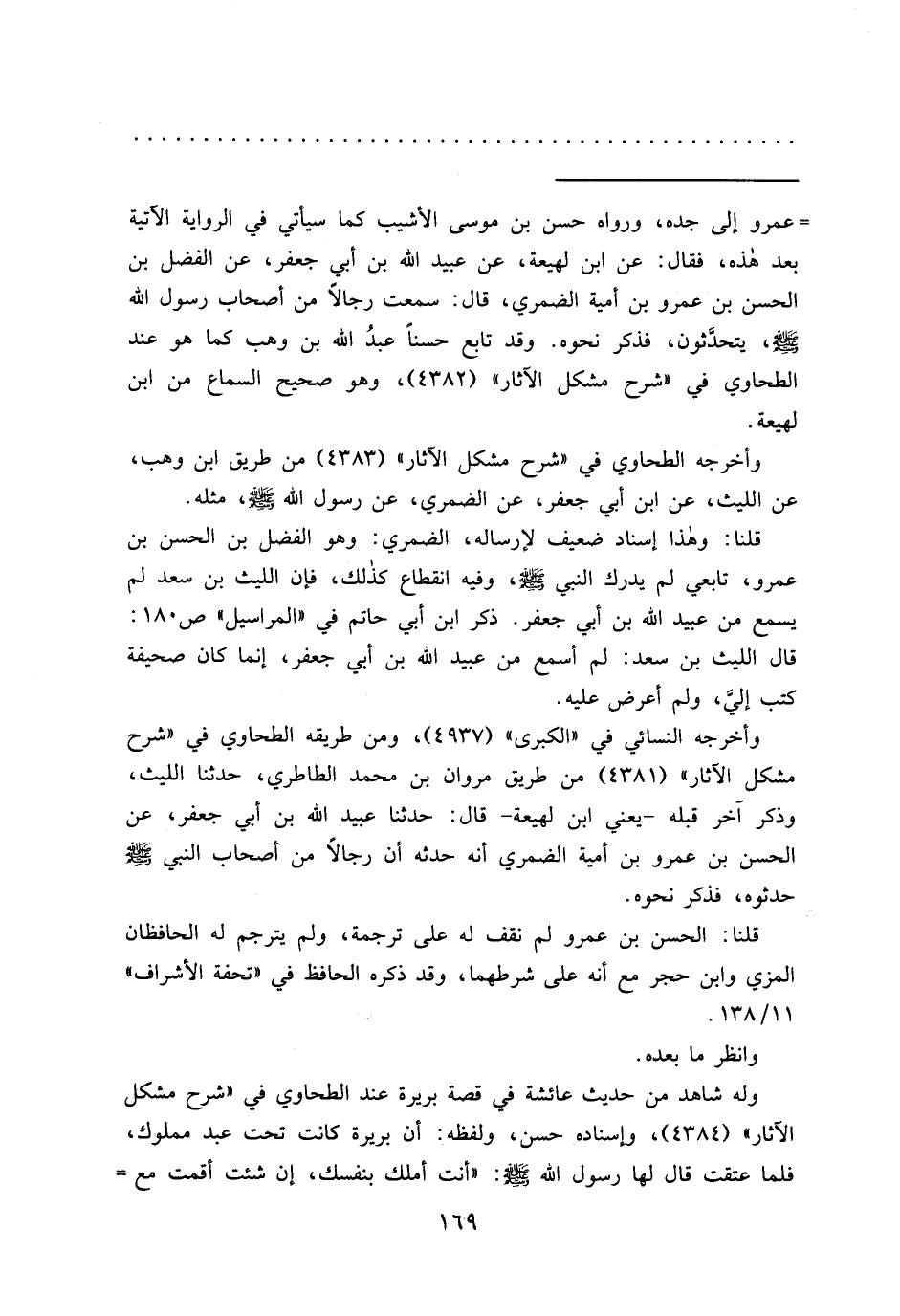 = عمرو إلى جده، ورواه حسن بن موسى الأشيب كما سيأتي في الرواية الآتية بعد هذه، فقال: عن ابن لهيعة، عن عبيد الله بن أبي جعفر، عن الفضل بن الحسن بن عمرو بن أمية الضمري، قال: سمعت رجالاً من أصحاب رسول الله صَلَّى اللهُ عَلَيْهِ وَسَلَّمَ، يتحدَّثون، فذكر نحوه. وقد تابع حسناً عبدُ الله بن وهب كما هو عند الطحاوي في "شرح مشكل الآثار" (٤٣٨٢) ، وهو صحيح السماع من ابن لهيعة.