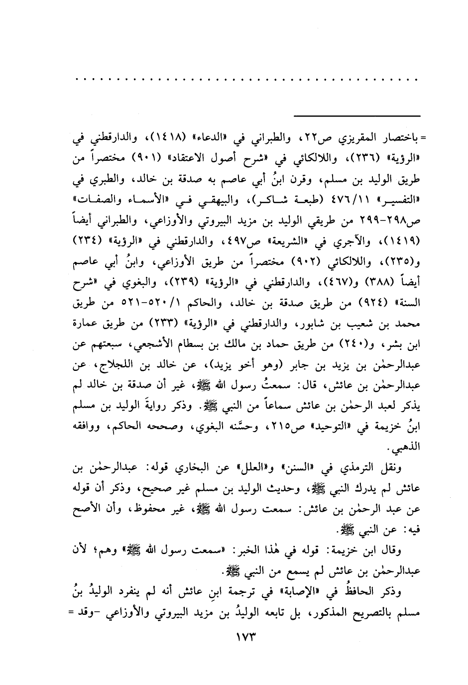 (١٤١٩) ، والآجري في "الشريعة" ص٤٩٧، والدارقطني في "الرؤية" (٢٣٤) و (٢٣٥) ، واللالكائي (٩٠٢) مختصراً من طريق الأوزاعي، وابنُ أبي عاصم أيضاً (٣٨٨) و (٤٦٧) ، والدارقطني في "الرؤية" (٢٣٩) ، والبغوي في "شرح السنة" (٩٢٤) من طريق صدقة بن خالد، والحاكم ١/٥٢٠-٥٢١ من طريق محمد بن شعيب بن شابور، والدارقطني في "الرؤية" (٢٣٣) من طريق عمارة ابن بشر، و (٢٤٠) من طريق حماد بن مالك بن بسطام الأشجعي، سبعتهم عن