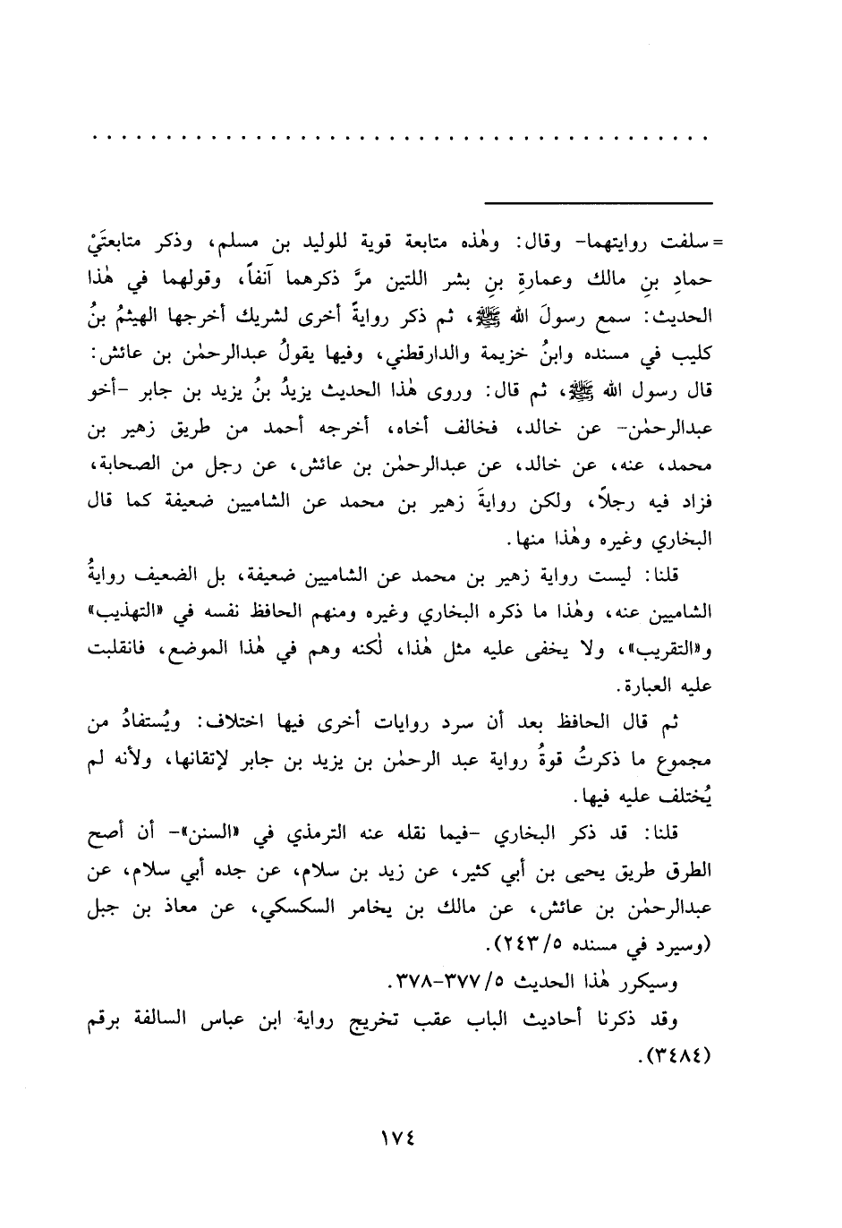 = سلفت روايتهما- وقال: وهذه متابعة قوية للوليد بن مسلم، وذكر متابعتَيْ حمادِ بنِ مالك وعمارةِ بنِ بشر اللتين مرَّ ذكرهما آنفاً، وقولهما في هذا الحديث: سمح رسولَ الله صَلَّى اللهُ عَلَيْهِ وَسَلَّمَ، ثم ذكر روايةً أخرى لشريك أخرجها الهيثمُ بنُ كليب في مسنده وابنُ خزيمة والدارقطني، وفيها يقولُ عبد الرحمن بن عائش: قال رسول الله صَلَّى اللهُ عَلَيْهِ وَسَلَّمَ، ثم قال: وروى هذا الحديث يزيدُ بنُ يزيد بن جابر- أخو عبد الرحمن- عن خالد، فخالف أخاه، أخرجه أحمد من طريق زهير بن